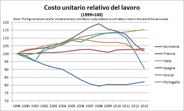 Qui sopra, il grafico dell’andamento relativo del costo unitario del lavoro (praticamente l’inverso della produttività rispetto ai costi del personale) in alcuni paesi europei. Come si vede, e si sa, l’Italia ha un costo molto alto (una produttività molto bassa): non c’è da sorprendersi se i salari sono sotto pressione (incidentalmente, basta guardare cosa è successo alle curve di Spagna e Grecia per essere molto preoccupati per i prossimi dati sulla povertà).