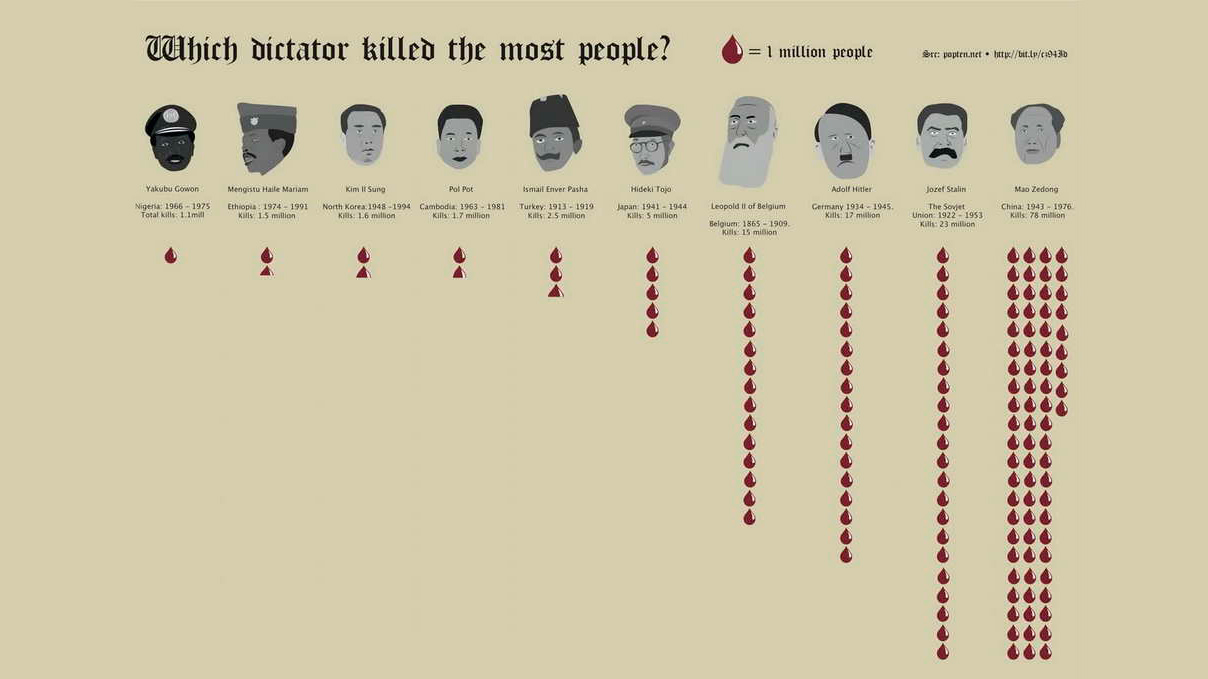 Poi naturalmente potete espandere queste succinte definizioni: ‘destra’ non è solo liberismo ma anche liberalismo (concetto con differenze rilevanti), e quindi le libertà individuali non sono solo quelle economiche ma anche politiche, artistiche, sociali in genere. L’idea di “merito” è centrale ma la meritocrazia tende a scivolare verso una certa indifferenza per chi meriti non sembra averne che rischia, di conseguenza, l’emarginazione. L’individualismo che facilmente diventa centrale in queste concezioni porta a equivocare i meriti individuali con le fortune sociali, a disprezzare il popolo ignorante, a diventare arroganza e poi diritto, con le conseguenze tragiche viste nella prima metà del secolo scorso. D’altra parte ‘sinistra’ non è solo equità sociale ma anche garanzia delle condizioni di partenza nella convinzione che se tutti sono sani, studiano e cooperano la società trovi impulso e sviluppo senza sopraffazione. Ma la forzata socialità annichilisce l’individualismo, spesso bandito come debolezza borghese (un insulto ingiurioso) e deresponsabilizza portando a forme di stagnazione economica e culturale viste sempre nel secolo scorso. Da qui a stigmatizzare i diversi (i più creativi, non solo i più ribelli) e a imputare loro le colpe del ritardo nel sorgere del Sol dell’Avvenire, il passo è breve e i gulag si preparano in fretta. Insomma: la destra ha dei valori importanti ma conduce a potenziali ingiustizie sociali e – se estremizzato – un certo tipo di dispotismo elitario; e la sinistra ha dei valori importanti ma conduce a potenziali irrigidimenti economico-sociali e – se estremizzato – a un certo tipo di dispotismo (presunto) collettivista (ma in realtà anch’esso elitario, sia pure diverso dal precedente). Le soluzioni proposte e sperimentate specie a partire dal secondo dopoguerra sono note: socialdemocrazie (e/o liberaldemocrazie) temperate, virtuose, meritocratiche, capaci di contemperare la libertà di mercato e il merito individuale con la solidarietà dello Stato sociale e la garanzia di una partenza uguale per tutti (scolarizzazione e sanità di massa). Una buona parte dell’Europa centrale e del Nord, Gli Stati Uniti e i Paesi di tradizione anglosassone hanno imboccato in forme diverse e non sempre senza contraddizioni anche gravi questa strada. I partiti si confrontano con programmi più o meno “liberisti”, più o meno “sociali”, e governano con atti concreti che i cittadini sono in grado di comprendere e valutare. Atti. Politiche. Interventi. Leggi. Soldi spesi e rendicontati. Non chiacchiere. Non ideologie. Chiacchiere, mancata rendicontazione e ideologie che invece resistono in democrazie incompiute e immature come quella italiana. Lungi da me annoiarvi con spiegazioni storiche sul perché quella italiana sia una democrazia immatura (sì, storiche; la condizione italiana è mirabilmente comprensibile conoscendo la sua storia!), semmai dedicherò un futuro post sull’argomento, ma classifiche, statistiche e indicatori internazionali questo attestano, e che l’Italia sia un Paese strutturalmente, economicamente e socialmente debole mi pare sia convinzione diffusa. Una delle ragioni – non l’unica – è il nostro essere ancorati alle ideologie del ‘900, quella destra dura e pura o quella sinistra nobile ed eroica che ci hanno contrapposti in tutto il ‘900 e che oggi, in quelle forme, non avrebbero proprio ragion d’essere. Non ci sono più il pericolo sovietico né quello nazista; la classe operaia è ormai da preservare in qualche riserva prima che sparisca del tutto, poiché l’industria manifatturiera è cambiata e quote preponderanti dell’economia si fondano su finanza e servizi; il nazionalismo esasperato ha pochissime ragioni d’essere come anche l’internazionalismo degli anni ruggenti, spazzate via dalla globalizzazione che è un’altra cosa… (come questo si rifletta in negativo sui partiti e le loro modalità di azione ne ho parlato tempo fa). Le ideologie sono semplificazioni astratte di modelli politico-sociali. Le ideologie (non nel senso originario settecentesco, ma in quello di fine ‘800 e del ‘900) erano conformi alla comunicazione necessariamente semplificata dell’epoca. Alla classe operaia che faticava e moriva in miniera prima e si alienava nelle catene di montaggio dopo non potevi andare a fare discorsi sofisticati sulla società liquida o sul pensiero debole ma dovevi dare una speranza, una parola d’ordine, un sistema concettuale semplice e visibilmente ancorato alla realtà: sei sfruttato, il tuo lavoro è espropriato dal padrone cattivo, solo i tuoi compagni – che condividono questa condizione – ti possono capire e solo con loro puoi costruire una società di uguali, dove regneranno giustizia, uguaglianza e benessere. Punto. Il Marx politico (molto più rozzo del Marx economico e assolutamente di più del Marx sociologo) questo diceva. Con la grande truffa di Engels (che stravolse le idee originarie di Marx) quel pensiero diventa “legge”, molto opportuna per le ambizioni di Lenin, poi per quelle di Stalin, poi per quelle di Mao, e via che diverse decine di milioni di controrivoluzionari veri o presunti sono stati ammazzati. dittatori [Fonte della figura. In realtà questa figura è più suggestiva che attendibile; per stime più affidabili si può leggere QUI] Ma torniamo al nocciolo dell’ideologia comunista: davvero la troviamo adatta, attuale, praticabile? Davvero la dittatura del proletariato? Davvero l’internazionalismo? Davvero il collettivismo? (Per l’analoga disamina delle ideologie della destra arrangiatevi da soli). Una persona che stimo molto mi ha fatto riflettere ricordando i milioni di persone che hanno creduto a queste ideologie e semmai sono morte per esse, e può darsi che la cosa faccia pensare anche voi. Gli operai sindacalizzati che sono finiti nelle patrie galere per difendere i diritti dei lavoratori fra ‘8 e ‘900 (e mio nonno 