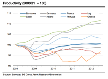 Abbiamo costi di produzione (relativamente) alti e produttività bassa. Abbiamo accumulato negli anni un grave ritardo in produttività rispetto soprattutto alla Germania, e questo non ha niente a che fare con l’Euro o con la politica monetaria (non ho spazio per argomentare, ma se volete approfondire sul serio leggete ad esempio qui). Sia chiaro: dire che l’Italia avrebbe bisogno di una svalutazione, equivale a dire che dovremmo ridurre i costi di produzione in Euro, a partire dai salari. In altri Paesi, come Spagna, Irlanda, Portogallo e Grecia, i salari reali sono già diminuiti. Questa è (sarebbe) la funzione della svalutazione: abbassare i prezzi e i salari italiani rispetto a quelli del resto dell’Eurozona. Questo è l’effetto che dovrebbe avere un’uscita dall’Euro, per avere senso: teniamolo a mente, perché non sono convinto che sia chiaro a tutti.