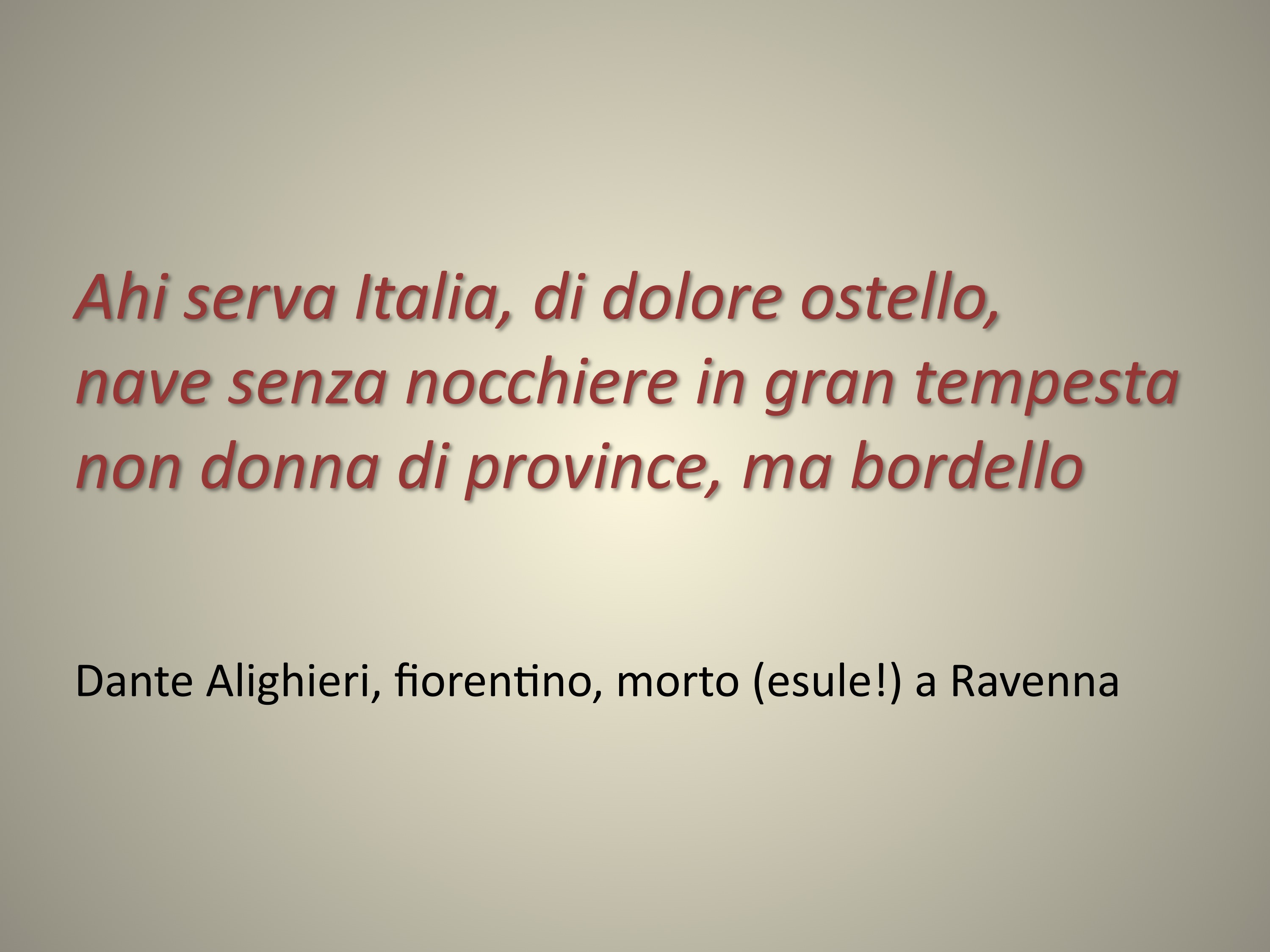 Quella che infatti non mancò mai nell’Italia di dolore ostello soprattutto negli uomini che nelle arti, nella letteratura e in tutte le manifestazioni della cultura la rappresentarono anche nell’epoca della sua massima “parcellizzazione” delle tante sovranità locali. Si tratta di un aspetto di grande rilievo, poiché è fuori di dubbio che il concetto di nazione, e ancor più la coscienza di ciò che esso significa, è sicuramente tra quelli che hanno trovato germoglio nelle persone di più elevato livello culturale. Asserzione che trova alta e sicura testimonianza, per quanto ci riguarda, nel Risorgimento italiano, sia pure al netto della discutibile strategia politica sottostante.