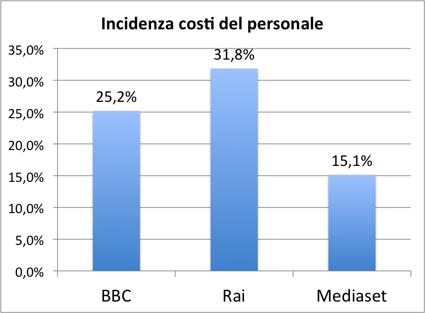 Già da questi numeri si vede che la Rai, per numerosità e costo del personale, è molto lontana non solo da Mediaset, ma (in proporzione al fatturato) anche dalla BBC. Questa difformità è particolarmente evidente nel grafico qui sotto, che evidenzia come i costi del personale della Rai incidano sul totale in misura proporzionalmente più che doppia rispetto a Mediaset e nettamente superiore anche alla BBC. grafico costi personale Tuttavia, la differenza tra Rai e BBC nell’incidenza delle retribuzioni non è solo legata al numero di dipendenti: la Rai ha un’incidenza nettamente più elevata di retribuzioni alte o altissime (non dispongo di dati relativi alle retribuzioni dei manager Mediaset, che però in quanto azienda privata risponde ad altre logiche specie per le figure manageriali).