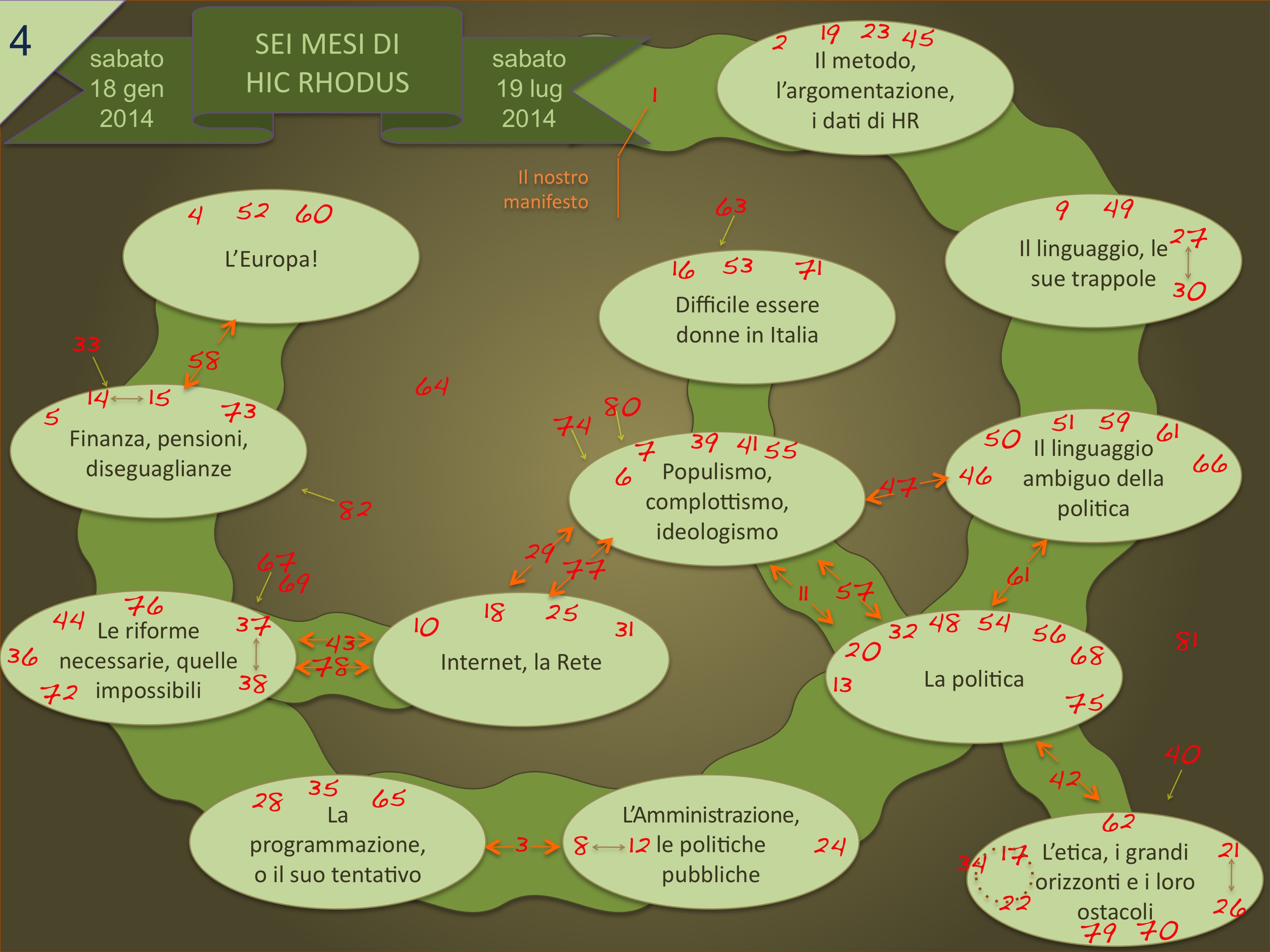 Sei mesi di Hic Rhodus! Ottantadue articoli (oltre alle mappe e ai “Ne avevamo parlato…”). Oggi festeggiamo coi nostri lettori e proponiamo un riassunto complessivo. Impossibile fare una mappa come le precedenti: ricomprendere tutti i testi in una sintesi grafica sarebbe complicato e inutile. Ecco allora la mappa dei concetti, dei luoghi, degli argomenti principali che hanno caratterizzato il nostro semestre; delineano un percorso abbastanza logico che esprime la voglia di argomentare, mostrare, discutere, non di asserire, strillare e chiudere gli occhi alle verità anche scomode.