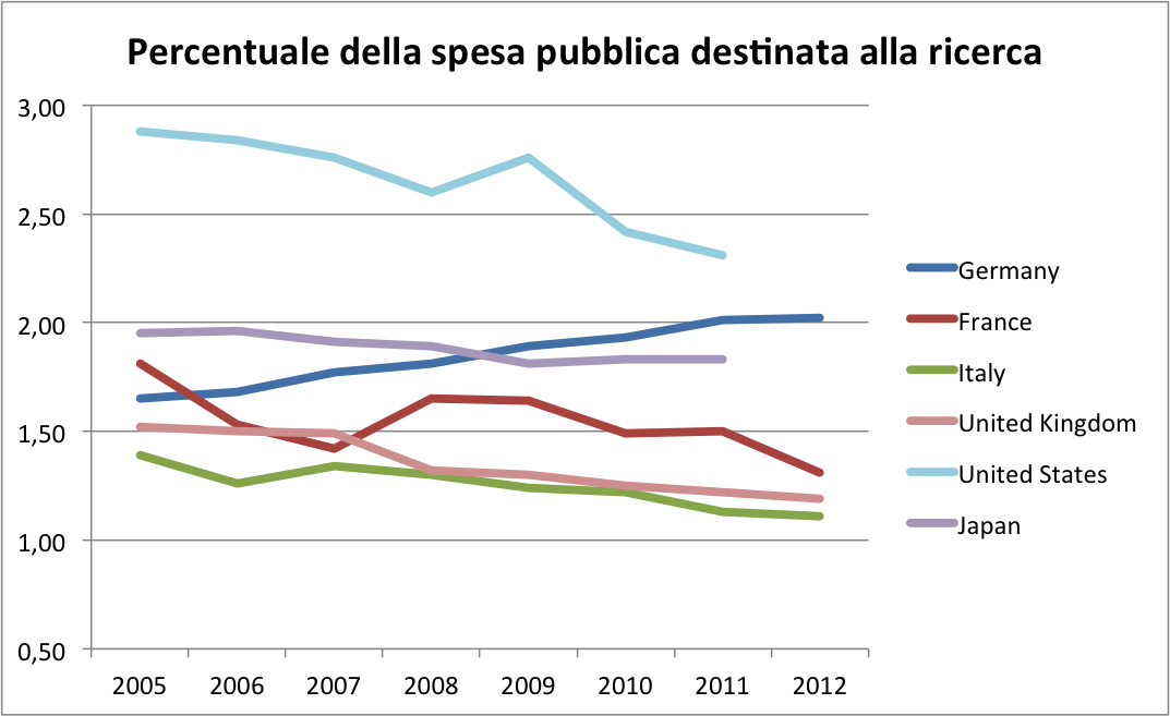 Come si vede, l’incidenza della spesa per la ricerca sul totale della spesa in Italia è calata di circa il 20% dal 2005 al 2012. Tra quelli qui rappresentati, l’unico Paese che ha fatto crescere significativamente questa incidenza è stato, guardacaso, la Germania; quanto questo abbia influito sui risultati che la Germania ha ottenuto in termini di innovazione, brevetti, eccetera, e di cui abbiamo parlato dettagliatamente qui, non è argomento di questo post.