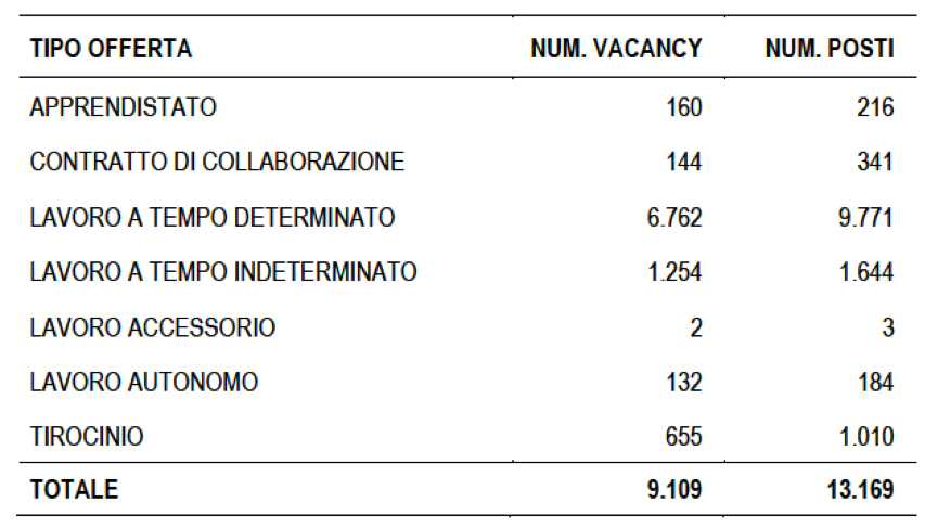 - Al momento sono stati resi disponibili oltre 13.000 posti di lavoro, suddivisi per tipologia secondo la tabella qui sotto; vale la pena di segnalare che il 71% dei posti offerti è al Nord.