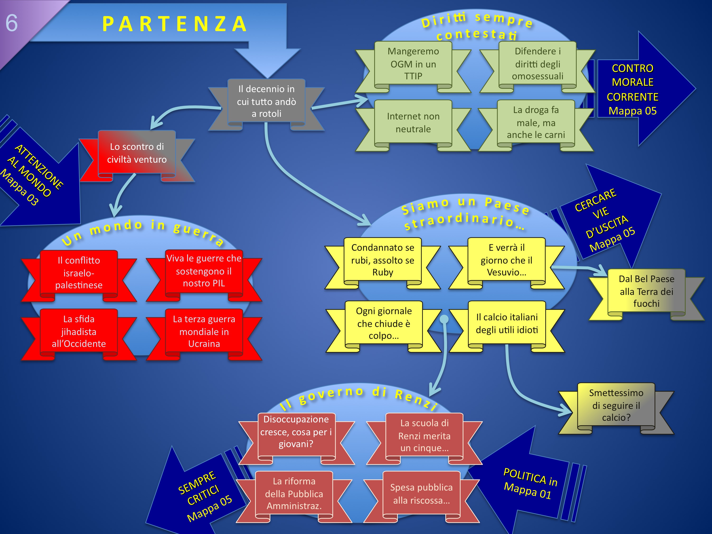 In questa mappa segnaliamo alcuni tipici nostri centri di interesse, o meglio: problemi che anche se non ci interessassero si impongono alle nostre coscienze: le guerre nel mondo, sempre più vicine a noi; i diritti sempre contestati, sempre da difendere; le difficoltà tutte italiane a cercare di essere un Paese normale e, agganciato a questo tema, quello dell’azione del governo Renzi.