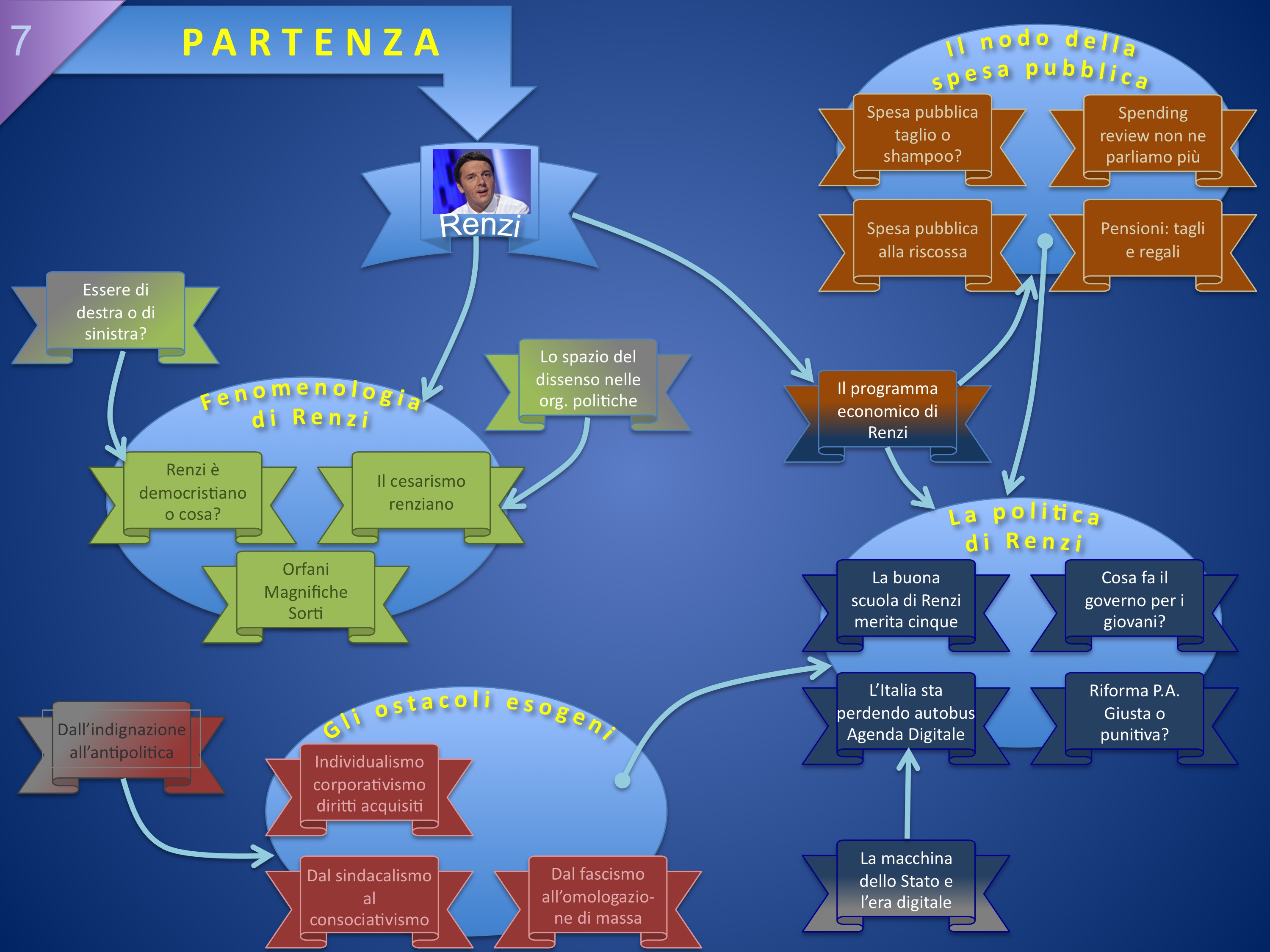 Un blog come Hic Rhodus, che parla molto di economia e politica, riflette spesso sulle attività del governo e sulle proposte del suo Primo Ministro Renzi. Non siamo quasi mai stati molto teneri con lui, pur cercando sempre di distinguere, nella migliore tradizione hicrhodusiana, gli elementi positivi, o quanto meno interessanti. Abbiamo ormai abbastanza articoli per dedicare a Renzi una delle nostre mappe. Intanto segnaliamo la particolare fenomenologia di Renzi, che si distingue con un’evidente discontinuità rispetto ai decenni precedenti; questa discontinuità, in sé, può essere giudicata positivamente ma, naturalmente, è la prova dei fatti quella che esprimerà il giudizio finale: la politica di Renzi è ambiziosa ma non sembra capace – al momento – di dare le risposte attese, anche a causa dei limiti imposti da una spesa pubblica che neppure Renzi riesce a frenare. Occorre segnalare, certo, che malgrado il decisionismo e il largo consenso popolare Renzi deve combattere contro molteplici ostacoli esogeni, ideologie, posizioni di rendita e derive culturali che oggettivamente ammorbano il quadro politico italiano. Questa la mappa dei nostri post (clic per ingrandire):