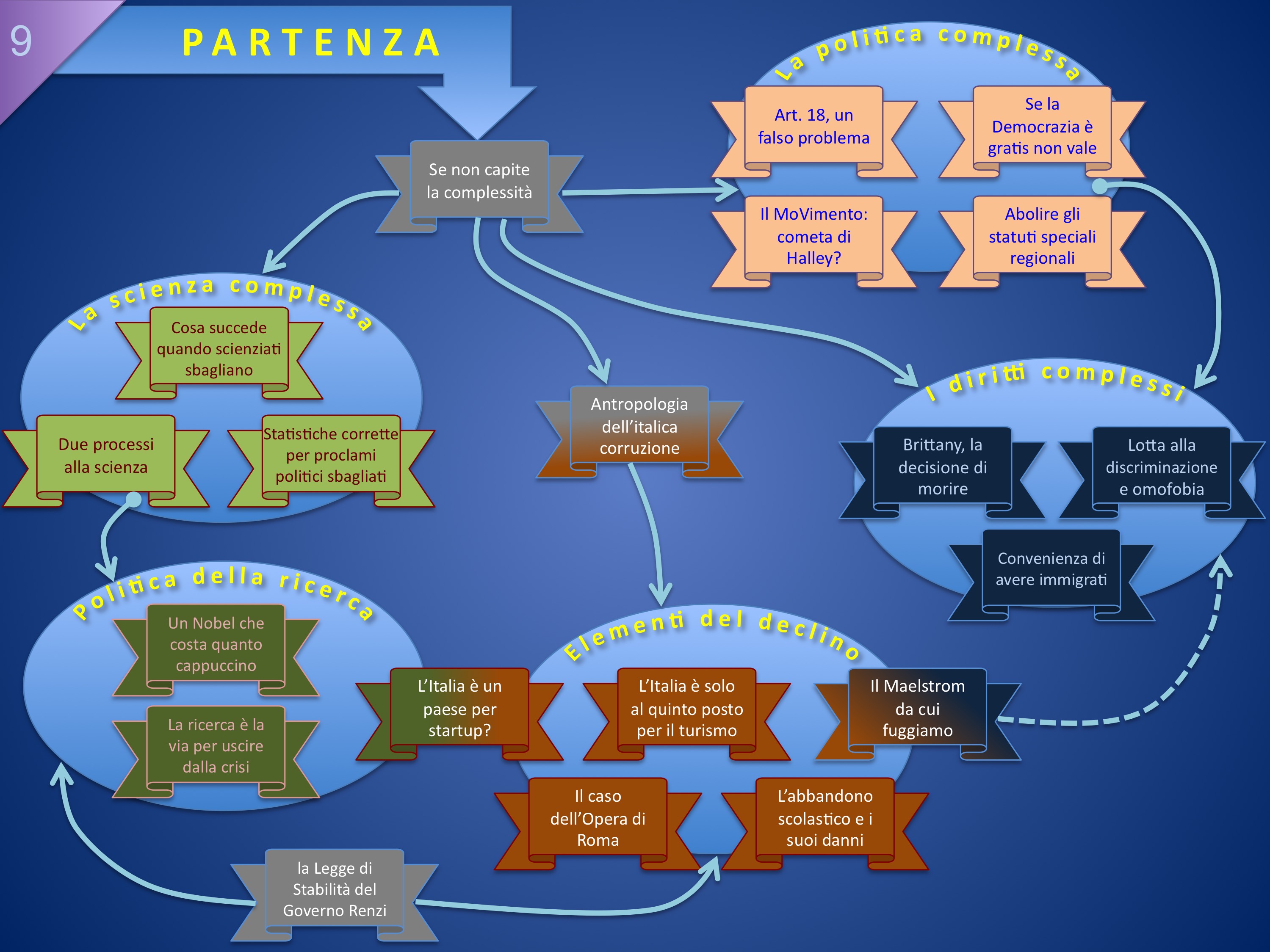 Il tema della complessità è ricorrente qui su Hic Rhodus. La mappa che segue riguarda solo gli articoli più recenti (sfogliando il blog, o col motore di ricerca, ne troverete molti altri) che abbiamo suddiviso in problemi di complessità nel mondo della scienza (con ricadute nella politica della ricerca), complessità della politica, complessità dei diritti e, come sintesi malinconica, una serie di articoli relativi a elementi del declino italiano, logica conseguenza di quanto precede.