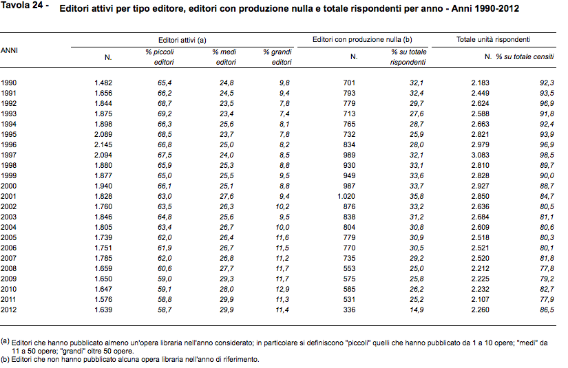 Nello stesso periodo gli editori sono calati, ma osservando un periodo più lungo (1990-2012) vediamo come dai 1.492 del 1990 ci sia stato un picco notevole fra la metà degli anni ’90 e i primi anni ’00, per poi calare e stabilizzarsi, in questi ultimi anni, attorno ai 1.600.