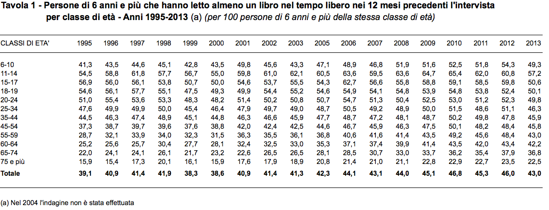 i lettori abituali (leggono cinque o più volte a settimana) sono passati dal 47,1% del 1995 al 36,7% del 2012.