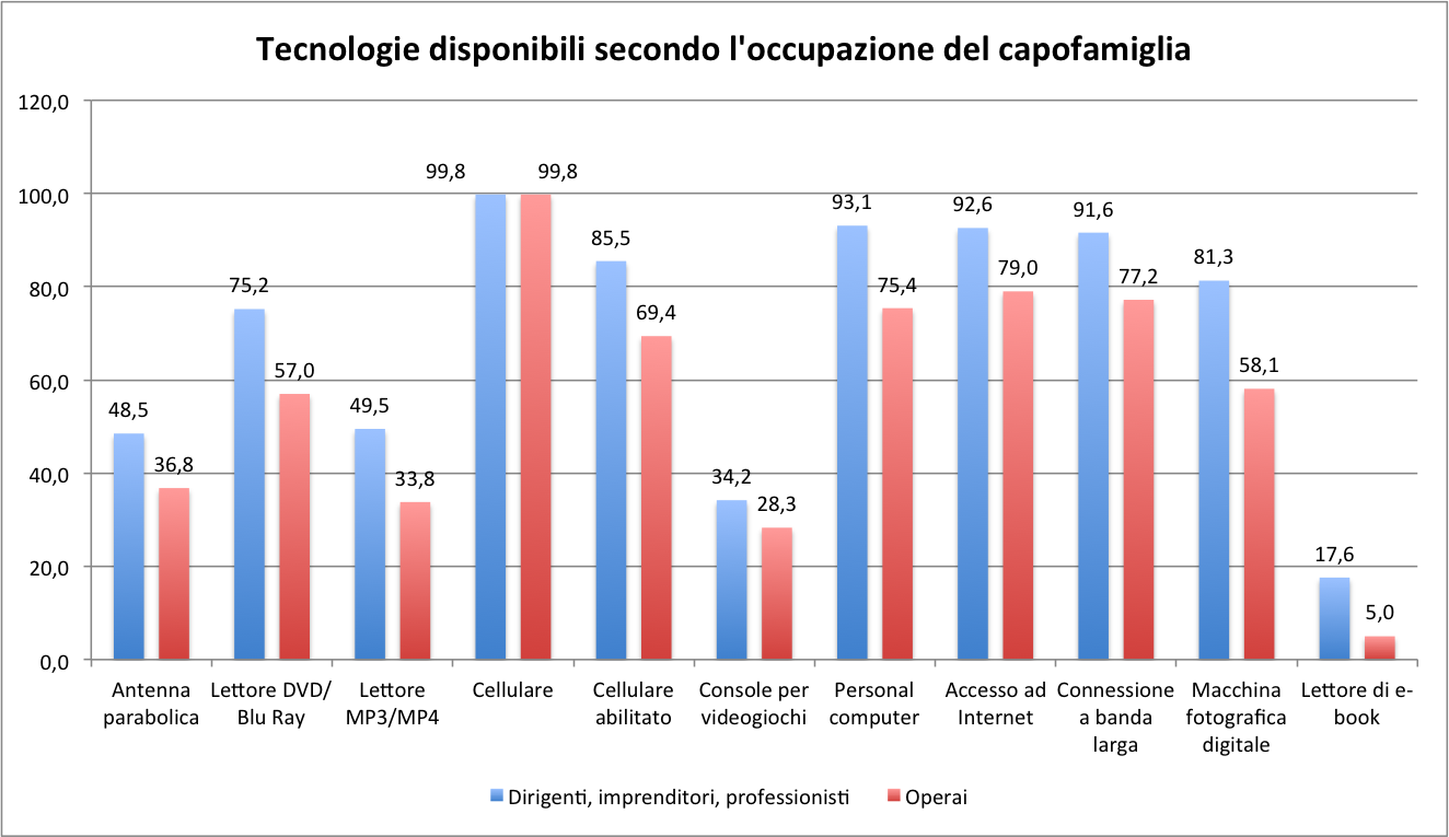 Come si vede, le famiglie di imprenditori e dirigenti hanno più strumenti tecnologici di quelle degli operai. Bella forza, direte, ed effettivamente non è certo sorprendente; anzi, devo ammettere che mi sarei aspettato un gap più accentuato.