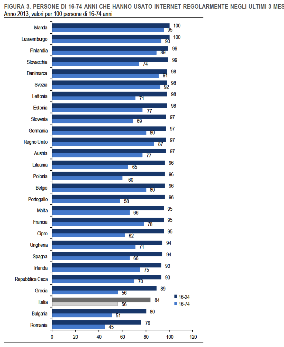 I dati, insomma, ci dicono chiaramente che quel tanto di innovazione tecnologica che le famiglie italiane stanno attraversando è trainata dai giovanissimi e dalle loro esigenze e comportamenti. Veniamo ora a capire meglio perché i nostri ragazzi usino Internet molto meno dei loro coetanei. Questo è vero anche per la fascia d’età che in assoluto utilizza più intensamente Internet, ossia quella tra i 16 e i 24 anni: