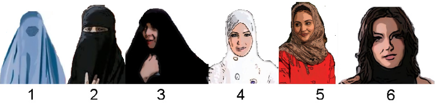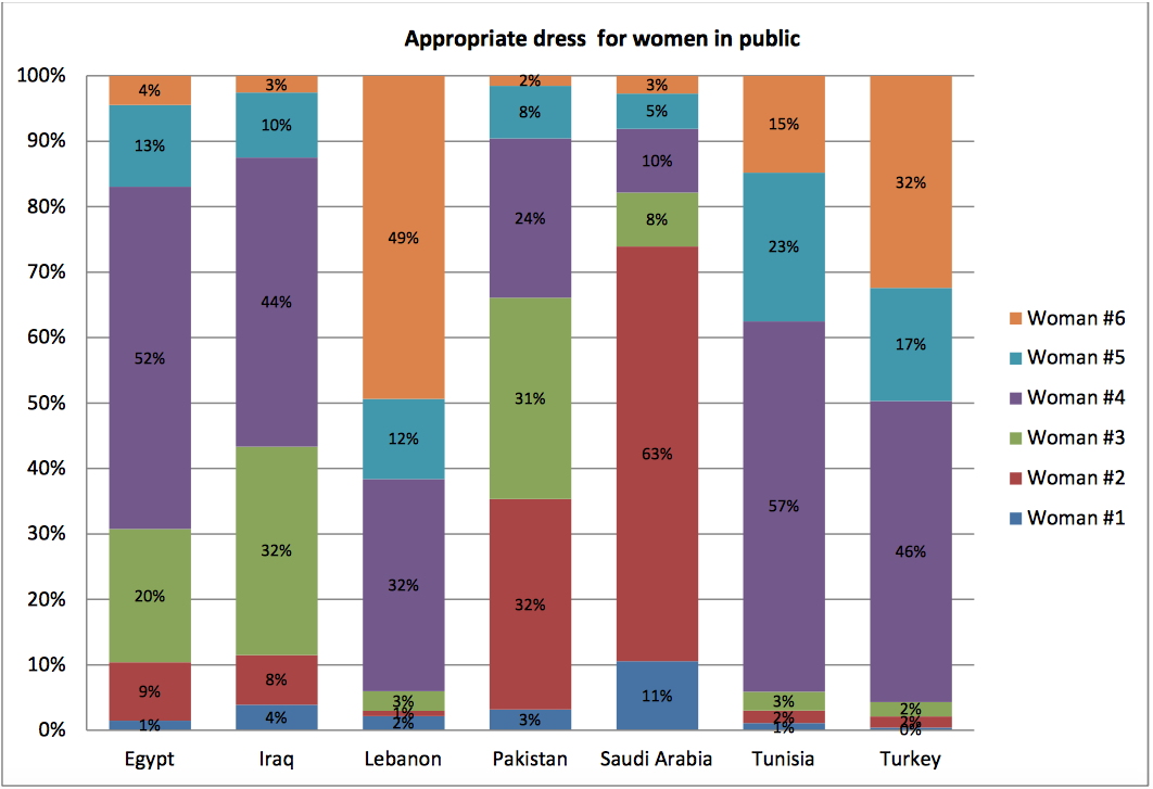 Based on these findings, it would be hard to connect women’s style of dress on the aggregate level to a country’s level of development and modernity. Saudi Arabia, which is economically more developed, is most conservative in terms of women’s style of dress. Rather, it reflects a country’s orientations toward liberal values as well as the level of freedom people enjoy. In Lebanon, Tunisia, and Turkey, where people tend to be less conservative than the other four countries, the preferable style for women also tend to be much less conservative than the other four countries (fonte).