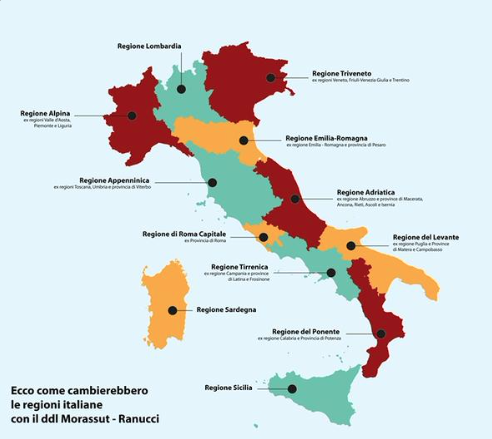 Due parlamentari PD, il deputato Morassut e il senatore Ranucci, hanno presentato un disegno di legge di modifica costituzionale per la riduzione delle Regioni, dalle attuali 20 a 12. La stampa ne ha brevemente parlato mostrando la mappa di come sarebbe ridisegnata la nostra geografia regionale, e chi ha buttato almeno un occhio sulla notizia sarà andato a vedere che fine potrebbe fare con questa riforma. A occhio e croce la prima proposta di cui mi ricordi era della Fondazione Agnelli più o meno, direi, trent’anni fa, e da allora di quando in quando il tema è stato sollevato diventando probabilmente più forte nella coscienza collettiva e più urgente oggi, sia perché si sta discutendo di riforma del Titolo V della Costituzione (che ha parecchio a che fare con qualunque manovra sull’architettura regionale) sia per il discredito che questa Istituzione ha presso i cittadini, per i troppi sprechi e scandali di cui molte Regioni si sono rese colpevoli. Chi ci segue su HR sa che siamo estremamente favorevoli a un accorpamento (non necessariamente questo proposto da Morassut e Ranucci, che come vedremo non ci pare esente da critiche) e vogliamo spiegare perché tale accorpamento va fatto segnalando, nel contempo, quante e quali difficoltà ci siano.