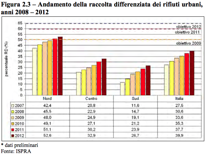 Anche se in questi ultimissimi anni si assiste a una diminuzione nella produzione dei rifiuti urbani (dopo anni di crescita), l’arretratezza del sistema italiano di smaltimento deve preoccupare. La prossima figura mostra, per esempio, la tendenziale crescita negli anni della raccolta differenziata, ma sempre costantemente lontana dagli obiettivi europei prefissati.