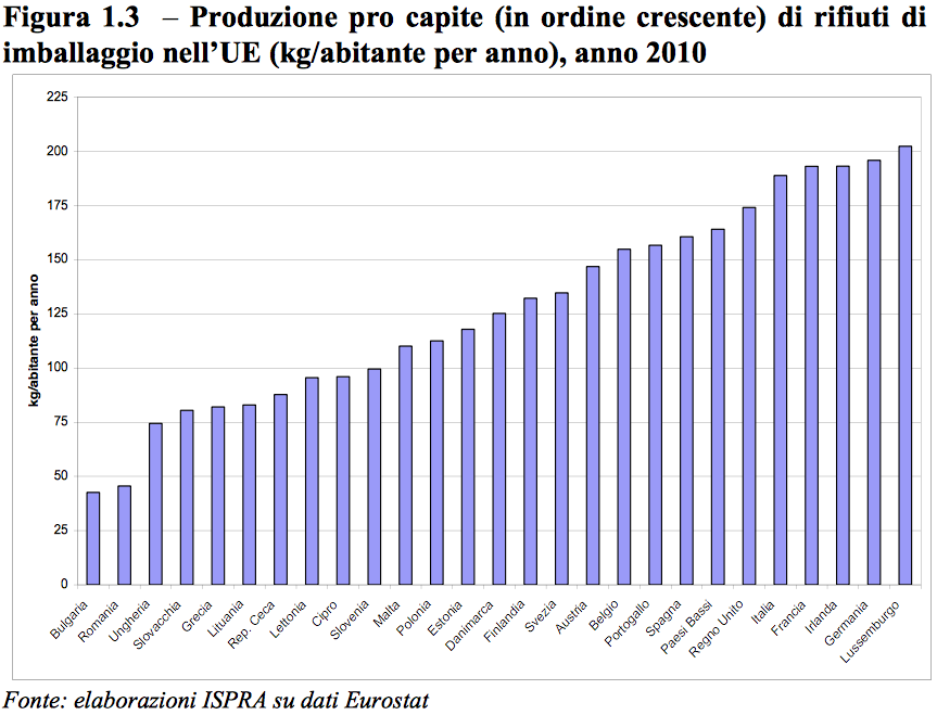 Come sempre le statistiche vanno approfondite e capite. Produrre meno rifiuti industriali, come abbiamo visto all’inizio (a causa, evidentemente, della specifica composizione della nostra industria) e non essere proprio fra i peggiori in quanto a smaltimento, non ci salva affatto dagli enormi problemi relativi ai rifiuti. Se per esempio guardate la prossima figure noterete come in Italia si produca una quantità rilevantissima di rifiuti di imballaggio sui quali mi vorrei soffermare.