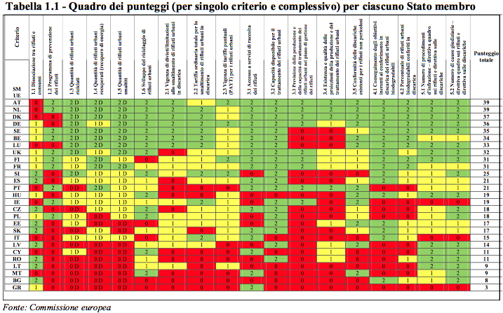 Il punteggio complessivo basato su una serie di parametri, inoltre, colloca l’Italia nelle posizioni di bassa classifica (20/27; rimando al rapporto Ispra già citato).