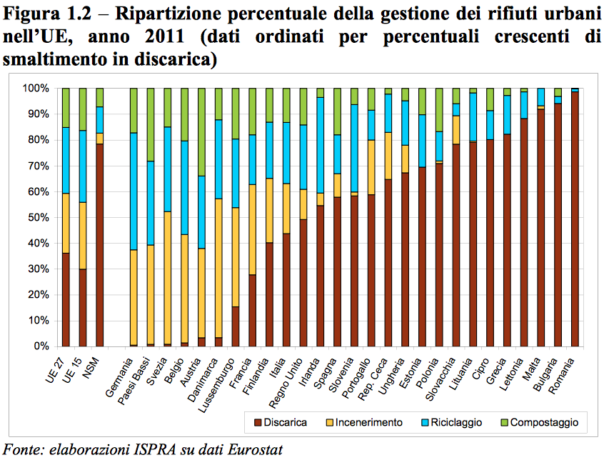 Tornando ai rifiuti europei la domanda è, ovviamente, dove vanno a finire prima che ci sommergano. Il Rapporto ISPRA rifiuti urbani 2013, ampiamente basato su dati Eurostat ci fornisce un quadro sconfortante: