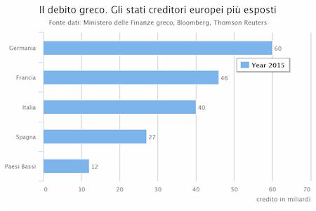 Il 72% è in mano a istituzioni pubbliche. Nel dettaglio: il 60% è – attraverso il fondo di stabilità europeo (l’EFSF) e il Meccanismo europeo di stabilità (l’ESM) – dell’Unione europea, il 12% è invece del Fondo monetario internazionale. La Banca centrale europea possiede l’8% mentre il 15% sono titoli di debito trattabili sul mercato secondario, di questi l’11% sono bond e il 4% sono prestiti a breve termine (fonte). Le banche greche sono poco esposte così come quelle straniere che dal 2008 in poi hanno continuato a ridurre la propria esposizione (da 128 Miliardi nel 2008 a meno di 40 attualmente – fonte). Questa situazione è esattamente il contrario di quella italiana dove solo il 35,6% del debito pubblico è in mani straniere (fonte) rendendoci un caso unico in Europa. Vale a dire: se l’Italia facesse default ci rimetterebbero i cittadini italiani, fallirebbero diverse banche e conseguentemente il sistema di credito alle imprese; se fa default la Grecia, senza negarne le ripercussione interne, piangerebbero specialmente gli Europei che le hanno imprestato una montagna considerevole di soldi (Italia terzo creditore).