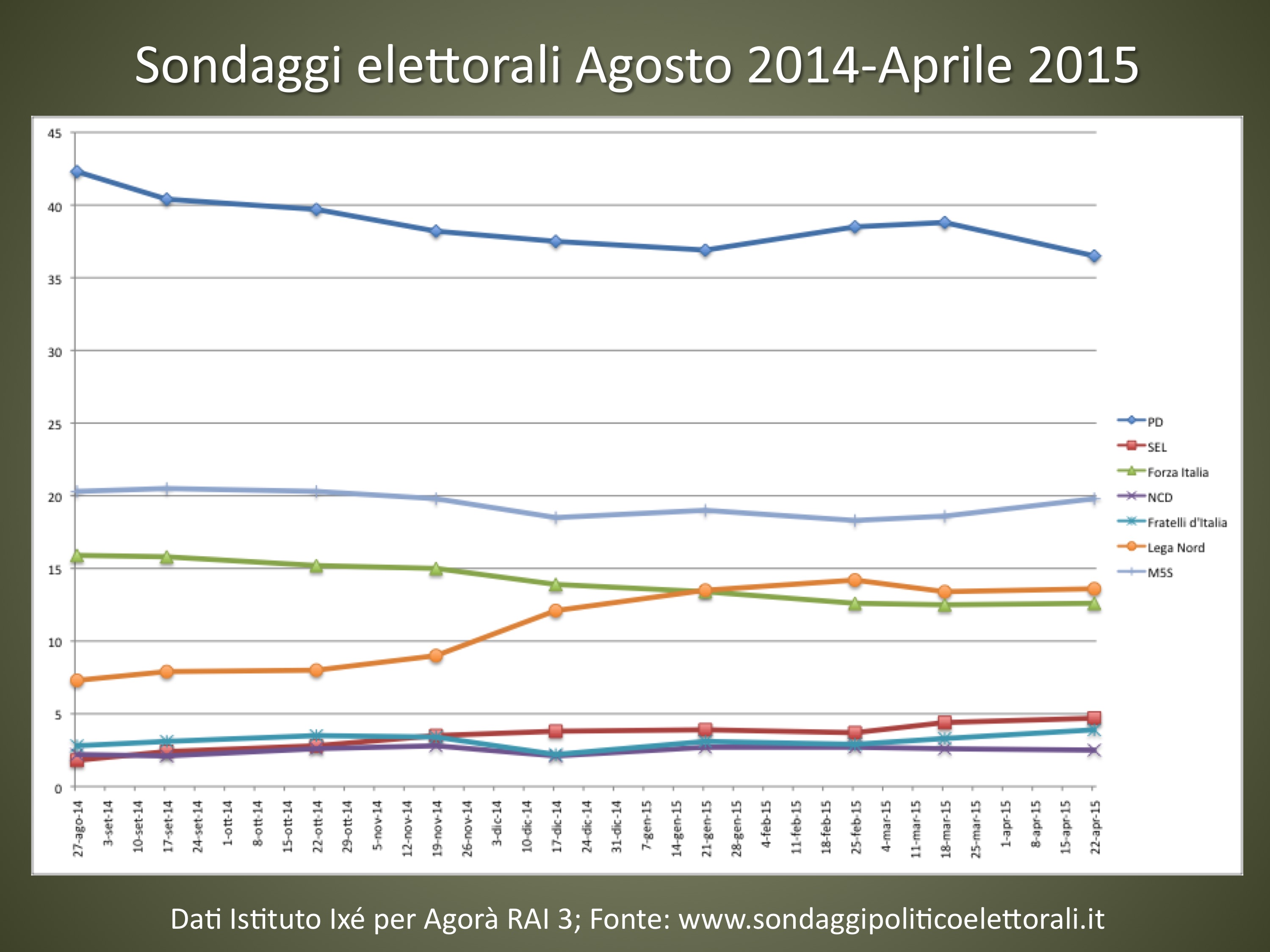 Al netto di ogni altra considerazione la Lega Nord ha semplicemente raddoppiato i voti, dal 7% di Agosto 2014 al quasi 14% attuale. Mettiamoci quindi l’anima in pace: la Lega Nord di Salvini, dopo gli scandali e i litigi interni che parevano avere dato il colpo di grazia ai leghisti, non solo è ben viva ma cresce, e cresce, e mangia elettorato berlusconiano (meno da altri partiti), recupera indecisi, attira nella sua orbita lepenista partiti minori come Fratelli d’Italia. Vogliamo capire il perché? Avranno un programma politico vincente, ovvio!