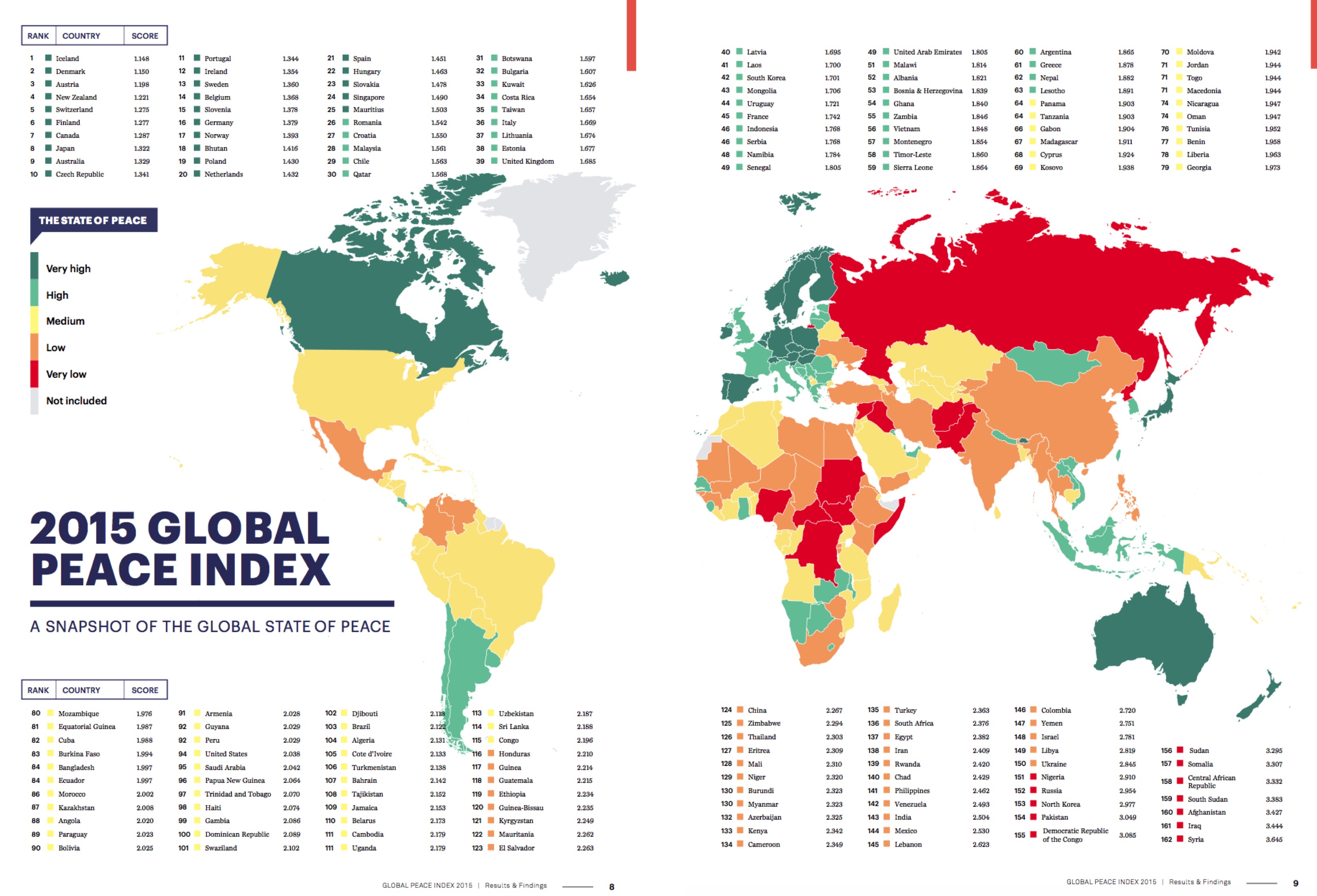 I paesi più grandi e industrializzati appaiono più aggressivi (da gialli a rossi) per ragioni piuttosto semplici da comprendere: per esempio più territorio e più confini e quindi maggiori forze di polizia ed esercito e quindi più spesa militare; i paesi più isolati appaiono più pacifici (verde) per ragioni altrettanto ovvie: contro chi dovrebbe combattere la Nuova Zelanda? In realtà il Rapporto fa una confusione pazzesca fra indicatori militari e indicatori di sicurezza sociale, che sono cose estremamente differenti (in termini tecnici si dice che quegli indicatori indicano concetti differenti); in Cina potete passeggiare a notte fonda per le strade della città e difficilmente sarete importunati, ma il suo colore (arancione) tradisce la potenza militare di quella nazione che però non è in guerra con nessuno (anche se alza abbastanza la voce coi vicini); il verdolino dell’Italia ci fa apparire abbastanza paciosi, ma io dopo una certa ora non vado in certi quartieri della mia cittadina di provincia perché pericolosi.