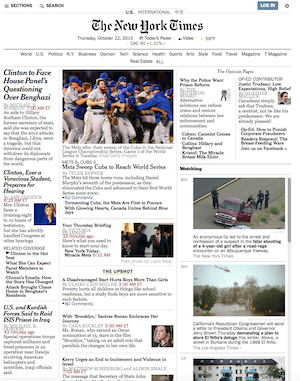 Schermata 2015-10-22 alle 15.10.04La domanda cruciale è: “è il mondo che va a rotoli o siamo noi italiani?”. Sono andato di corsa a vedere pagine di giornali stranieri: il New York Times apre con molta politica americana e sport e con opinioni su tematiche molto generali; seguono, poco sotto, la politica estera e temi che potremmo definire sociologici (per esempio lo svantaggio di genere nella scuola che colpirebbe più i maschi) e svariate corrispondenze estere; c’è molto “estero” nel NYT… L’inglese Telegraph (ma scelgo abbastanza a caso, sempre nelle edizioni on line del 22 Ottobre) apre con politica e opinioni; cronaca non solo britannica, poco sport. Il francese Le Monde apre con Néthanyaou e prosegue con moltissima politica estera… Insomma: anche a uno sguardo superficiale, comparando le pagine dei giornali, si comprende come:
