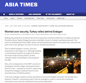 Worried over security, Turkey rallies behind Erdogan, di M.K. Bhadrakumar, “Asia Times”, 2 Novembre 2015: