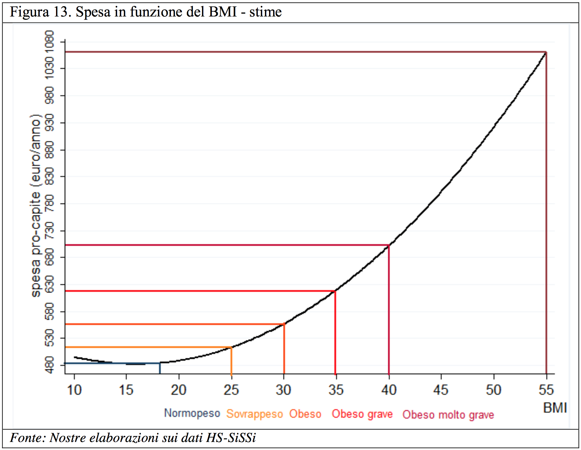 I costi dell’obesità. Le patologie correlate all’obesità hanno un costo elevato per la collettività. Uno studio del 2012 di Atella e Kopinska, dell’Università di Tor Vergata riepiloga in quattro categorie questi costi: i costi medici diretti, i costi in termini di produttività persa, i costi di trasporto e i costi del capitale umano. Lo studio è complesso e articolato e invito gli interessati a consultarlo per i dettagli; gli studiosi arrivano a calcolare il costo annuo in Euro, per il Servizio Sanitario Nazionale, di ogni singolo punto di massa grassa in eccesso mostrando comunque come le persone sovrappeso e obese costino molto di più alla collettività (per farmaci, visite specialistiche etc.).