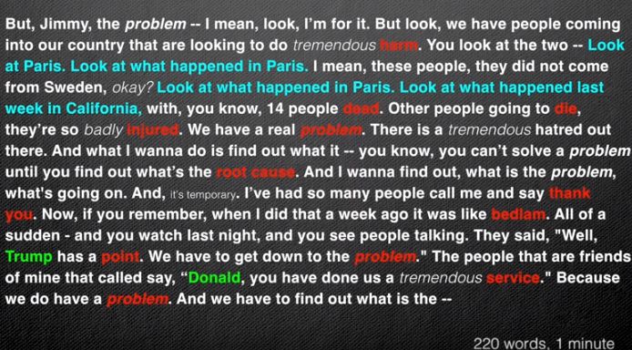 Donald Trump, da parte sua, è tutt’altra specie di animale politico. Disprezza la political correctness, insulta gli avversari, litiga con i giornalisti (e ancor più con le giornaliste), è aggressivo e non fa nulla per apparire competente. Proprio per questo incarna, a mio avviso, il modello di comunicazione cui siamo stati abituati, e che abbiamo imparato a non rifiutare, nel nuovo millennio, “grazie” a reality show sempre più triviali e Social Media sempre più “urlati”. Su YouTube c’è un interessantissimo video che analizza una breve risposta di Trump alla domanda di un intervistatore televisivo a proposito del tono discriminatorio di molte prese di posizione di Trump nei confronti di immigrati e musulmani; l’autore dell’analisi osserva che la struttura delle frasi di Trump è elementare, priva di parole lunghe, subordinate e periodi complessi, e che alla fine di ogni semplice e breve frase Trump colloca una parola forte, come “problema”, “danno”, “causa”, “morire”, “feriti”, ecc. “Trump usa questa tecnica più di chiunque altro io abbia mai ascoltato”, commenta sempre l’autore del video.