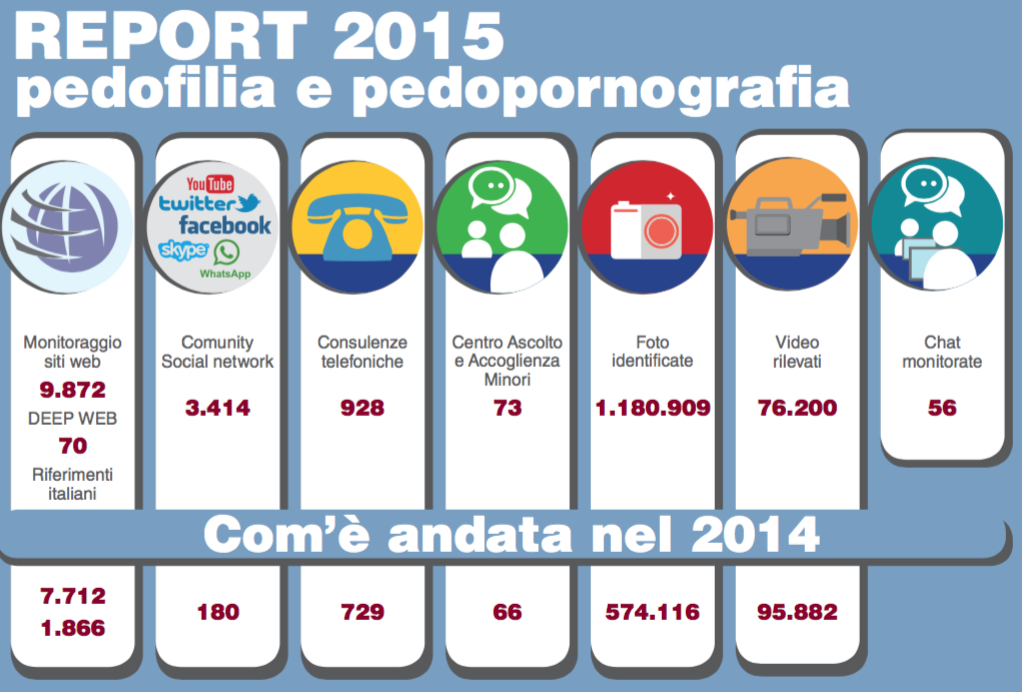 Il Rapporto Meter 2015 riporta di migliaia di siti pedopornografici individuati, specie nel deep web, decine di migliaia di video, foto oltre il milione. Il primato dello scambio pedopornografico è europeo col 52%. I siti segnalati da Meter alle autorità sono ben 125.365 dal 2003.