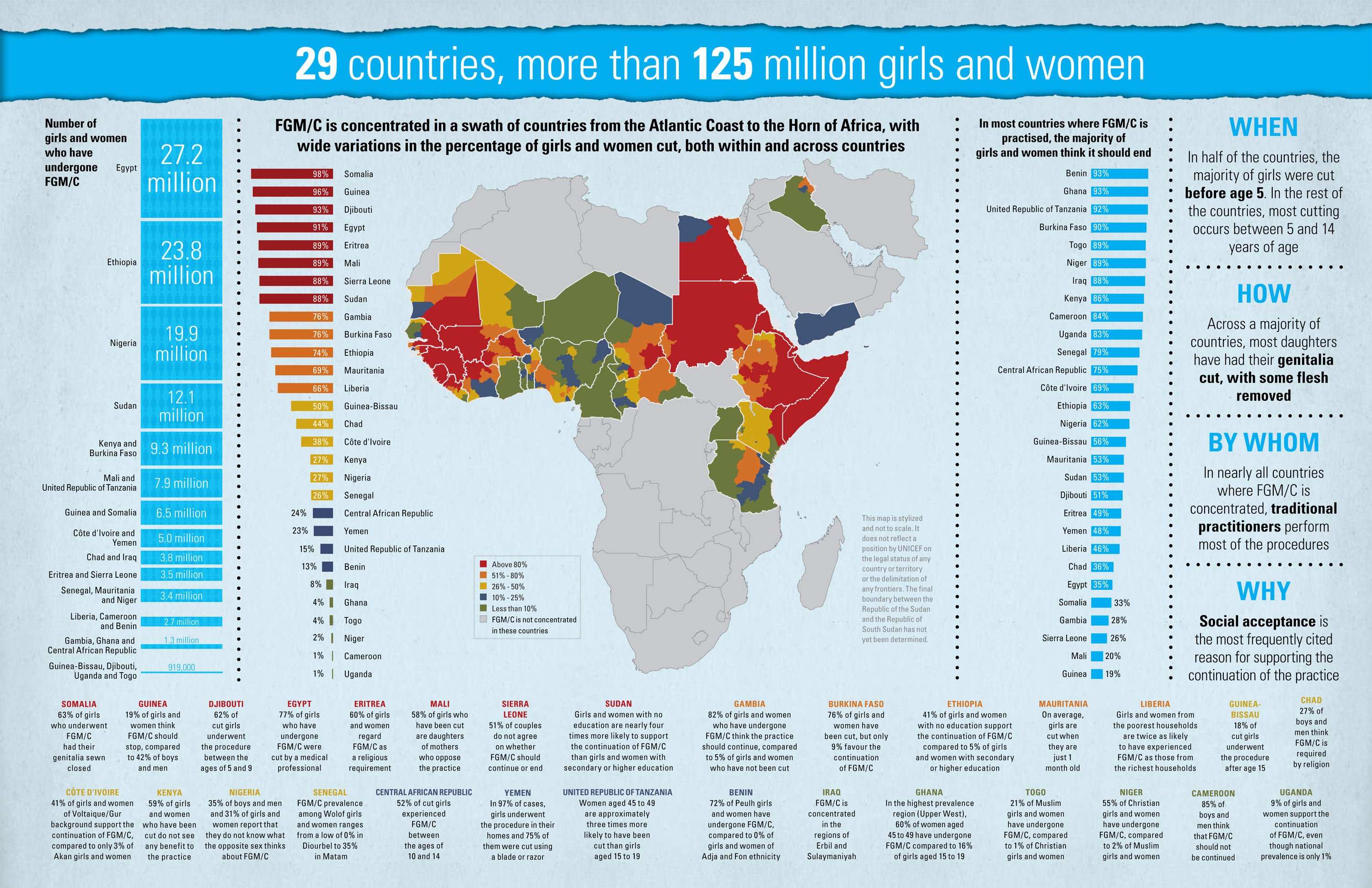 In alcuni Stati del Corno d’Africa (Gibuti, Somalia, Eritrea) ma anche in Egitto e Guinea l’incidenza del fenomeno rimane altissima, toccando il 90% della popolazione femminile. In molti altri, invece, le mutilazioni riguardano una minoranza – fino ad arrivare a quote dell’1-4% in paesi come Ghana, Togo, Zambia, Uganda, Camerun e Niger.