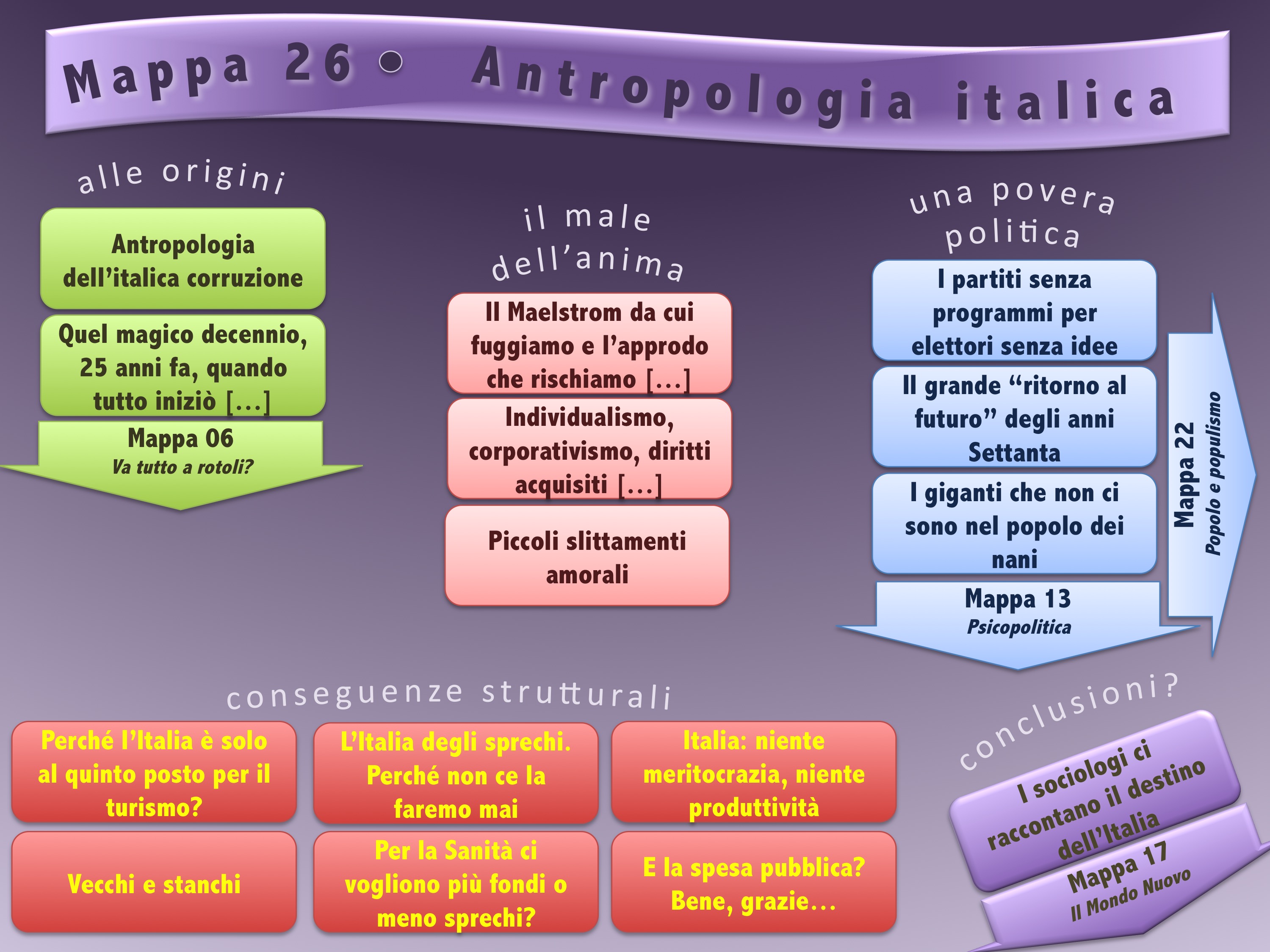 Hic Rhodus parla da sempre di questa minorità italiana, questo limite antropologico che appare insormontabile e che è noto da secoli; siamo eccezionali, creativi, straordinari, ingegnosi, simpatici (per non dire dell’arte amatoria!); ce lo diciamo fra noi, sia chiaro, mentre la capitale dell’arte, della cultura, della moda, dell’architettura, del turismo, dell’accoglienza, dell’artigianato, della competenza tecnologica, del cinema, etc. etc. è ovunque tranne che in Italia. Una volta, sì, avevamo la compagnia aerea più innovativa al mondo, l’industria cinematografica più invidiata, una letteratura di spessore, una politica estera importante almeno nel cortile di casa, degli statisti di livello internazionale, degli imprenditori eroici e capaci… ero bambino io, figuratevi! Dove sono finiti tutti? I pochi eroi civili, oggi, dove sono? Cosa fanno? Ho mente dei nomi, sì, perché ci sono; hanno quasi tutti un inutile ruolo di testimonianza, gridano al vento, racimolano retorici assensi dall’alto e inutili like dal basso. Siamo preda di familismo, personalismo, clientelismo, affarismo di rapina, Francia o Spagna purché se magna, … Ne scriviamo da tanto, dicevo, e non so se convenga ribadire qualcosa. La Mappa 26 che trovate qui sotto vi offre certamente una buona selezione di testi, su vari argomenti, ciascuno dei quali capaci di togliere l’appetito, o il sonno, a chi vorrebbe un’Italia per niente straordinaria ma, semplicemente, normale.