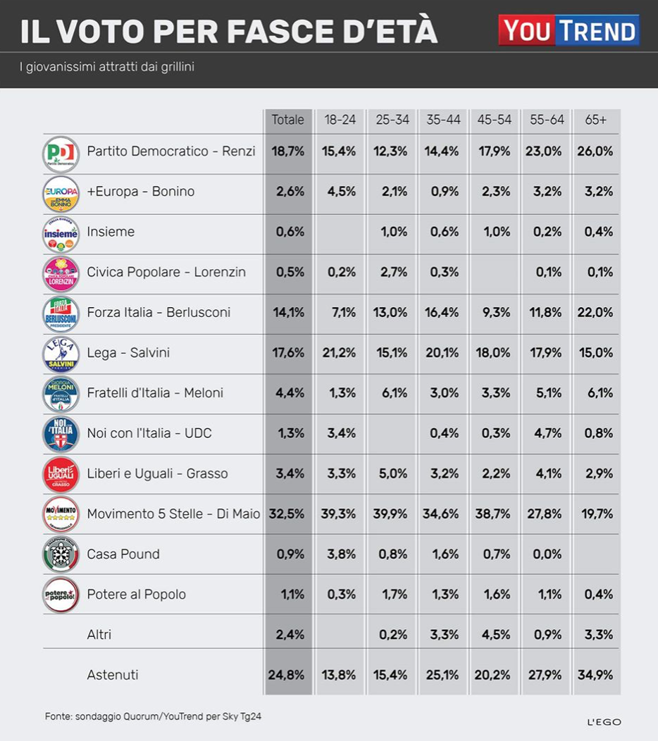 Voto per fasce d’età (click) La crisi mortale delle ideologie del Novecento (che è un fatto reale) assieme alla crisi politica descritta sopra, ha portato fatalmente la sinistra a non avere nulla da dire al suo tradizionale elettorato (operai, ceti medio-bassi, giovani…) e a non riuscire a dire nulla neppure ai nuovi cittadini ai quali avrebbe dovuto e saputo rivolgersi con una nuova proposta di “sinistra”. Non ha saputo dare una risposta alla domanda “cosa significa essere di sinistra nel terzo millennio?”. Chi è rimasto ancorato alle idee del secolo scorso non ha futuro, e il declino della Cgil, come il disastro di Liberi e Uguali, ne è chiara testimonianza. Ma anche chi non sa parlare un nuovo linguaggio, come oggi il PD, è perduto.
