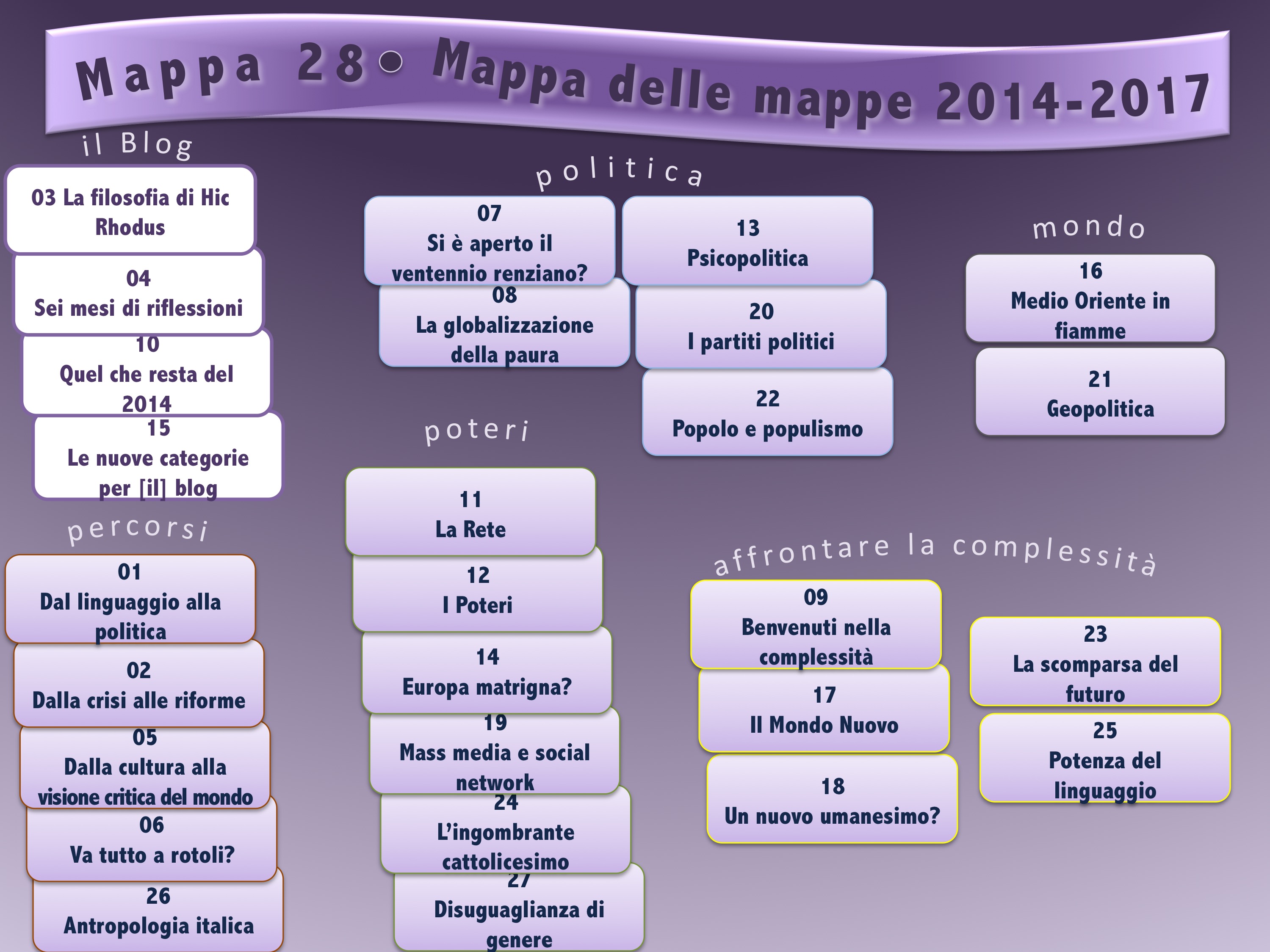 Comunque sia, questa è la mappa delle mappe 2014-2017, coi suoi raggruppamenti logici e i suoi percorsi interni.
