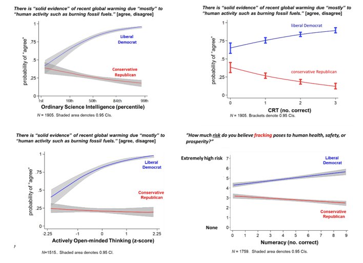 Anzi, un recente articolo della rivista Scientific American riporta risultati di alcune ricerche in ambito psicologico che fanno ritenere che una maggiore preparazione su argomenti scientifici e sulla matematica, e un “punteggio” più alto in quello che gli autori definiscono “actively open-minded thinking”, non solo non riducano la tendenza ad accettare solo l’evidenza scientifica che rafforza i propri preconcetti, ma addirittura l’accentuino. Come evidenzia la figura qui sotto, relativa alle opinioni sul riscaldamento globale, più aumenta il grado di “alfabetizzazione scientifica” delle persone, più queste tendono ad adottare con forza l’opinione allineata con il proprio schieramento politico.