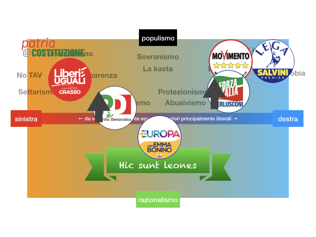 Ho messo una freccia puntata verso l’alto per forza Italia che, in grande affanno, ha deciso di accodarsi al carro populista, e al PD che, con Zingaretti, temo abbia fatto una scelta che potrebbe trascinarlo su posizioni più populiste.