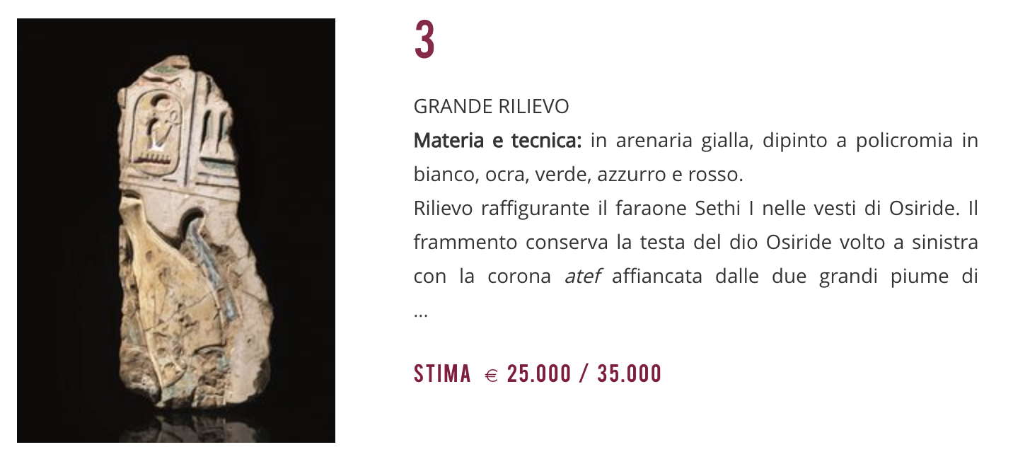 Da una qualunque casa d’aste, prendendo il primo pezzo esposto, vedo questo sasso con un po’ di rilievi egizi, 72 cm, valore d’asta fra i 25.000 e i 35.000 Euro.