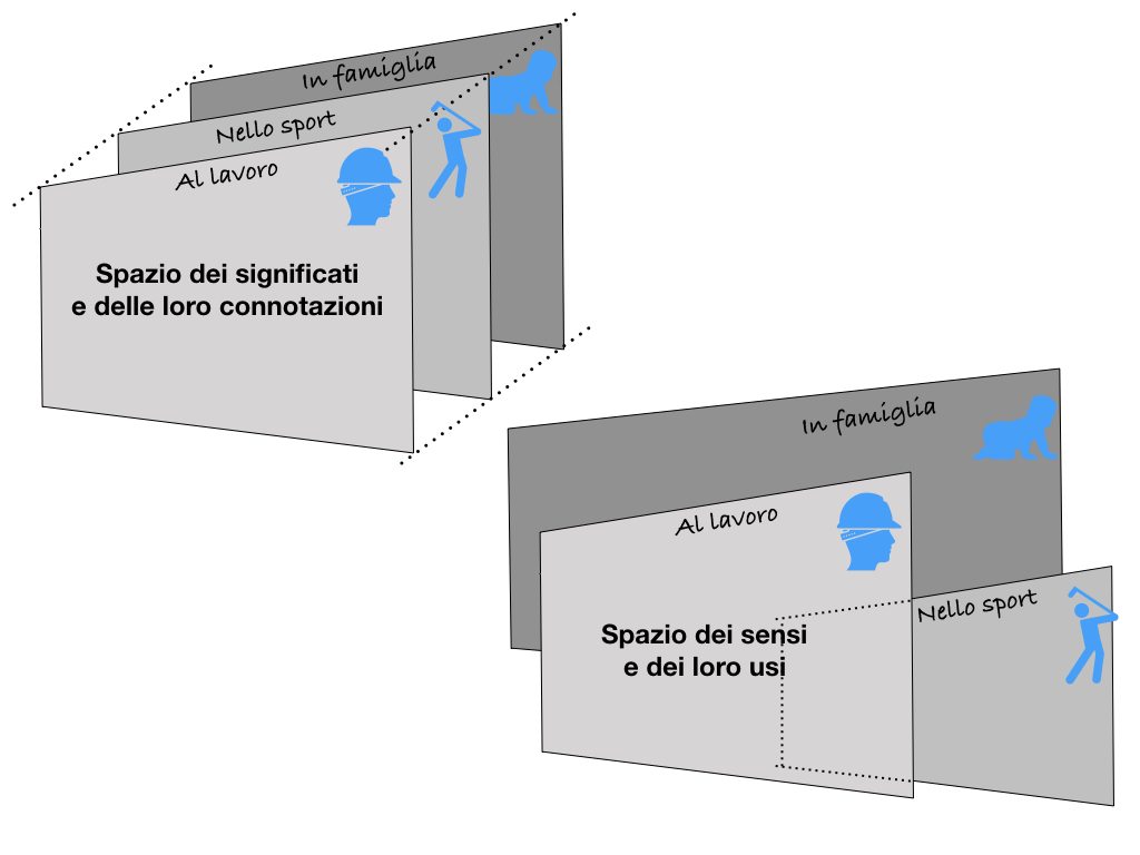 La parte in alto a sinistra mostra l’illusione della medesima semantica, e l’uso prevalente della sintassi come omologa nelle diverse situazioni e con diversi interlocutori. Quella in basso a destra mostra (con eccesso di schematismi) una realtà in cui le medesime parole si dispongono, dal punto di vista semantico, su “spazi” differenti, non necessariamente coincidenti. (Abbiate pazienza per la grossolanità della rappresentazione grafica). Gli attori sociali che si muovono (non importa il grado di consapevolezza, non necessariamente con l’estrema rigidità della figura) nello scenario alto, rischiano di restare prigionieri della loro sintassi ovvero (spero che sia chiaro) da una specifica e immutabile rappresentazione del mondo; da valori non negoziabili; da autorappresentazioni senza grande adattabilità. Il mondo (tutti i mondi possibili, quelli esperiti, quelli conosciuti per sentito dire, quelli immaginati) è oggetto di una interpretazione univoca, basata su un linguaggio immutabile. Chi padroneggia lo scenario in basso, invece, si sa “muovere” fra i mondi, e quindi meglio li comprende, sa adattarsi, essere più empatico e, in conclusione, comprende meglio gli altri e riesce a farsi meglio comprendere. I primi sono ottimi attori del loro unico canovaccio: passano la vita a recitare Amleto e lo fanno davvero bene, ma non chiedete loro di rappresentare Edipo a Colono! I secondi se la cavano più o meno benino in molti testi: fanno un Amleto accettabile, un Edipo a Colono apprezzabile, un Natale a casa Cupiello passabile. Se gli chiedete di riempire un buco in Vita di Galileo, probabilmente diranno di sì e se la caveranno senza ignominia, anche se forse non brilleranno.
