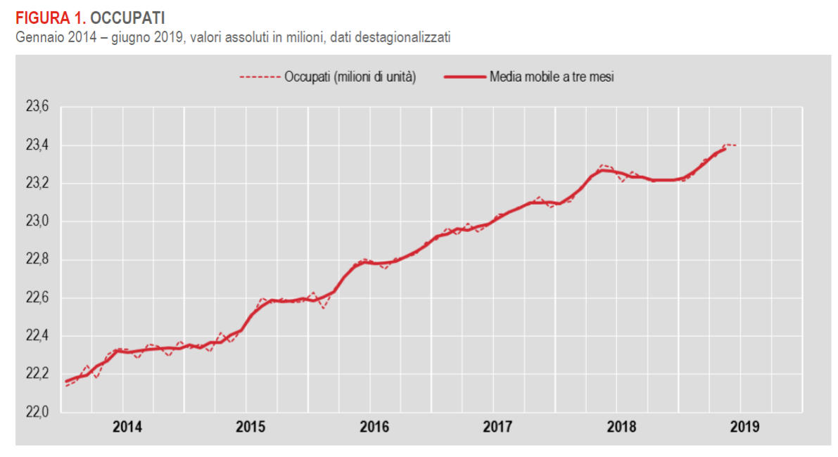 Qui devo fare una confessione: quando il governo produsse il cosiddetto Decreto Dignità (vabbe’…), personalmente ero convinto che gli effetti sarebbero stati nella migliore delle ipotesi nulli, e più probabilmente negativi. Ma i dati sono più importanti delle opinioni, e i dati dicono che mi sbagliavo: come si vede dal grafico qui sotto, dopo una lieve flessione nel 2018, il numero di occupati in Italia ha ripreso a crescere, e adesso è leggermente superiore a quando s’è insediato il Governo Conte, con un aumento in particolare degli occupati stabili. Considerato l’andamento del PIL e la situazione complessiva, è un risultato sicuramente buono.