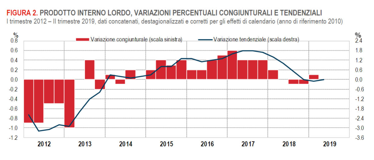 Nel frattempo, tutti gli indicatori economici sono peggiorati, in parte per cause internazionali e in parte per l’assenza di linee guida chiare e di investimenti produttivi, mal rimpiazzati da sprechi di denaro gettato nelle fornaci dei fallimenti di Stato. Solo per prendere l’indicatore più ovvio, qui sotto trovate il grafico dell’andamento del PIL, che guardacaso da un andamento discreto dei tre anni precedenti si “sgonfia” fino a crescita zero dal secondo trimestre 2018.