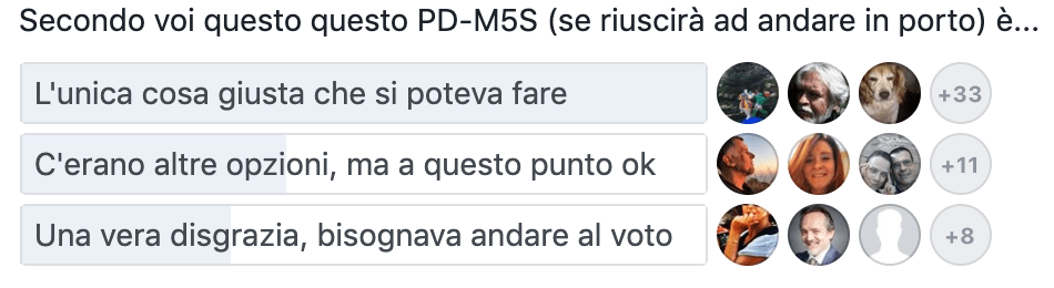 Quanto piace il tentativo in corso di governo PD-M5S ai riformisti, europeisti, democratici, diciamo: ai lettori tipici del blog Hic Rhodus? Tantissimo. Vi possiamo fornire sostanzialmente in anteprima i risultati di un sondaggio fatto sul gruppo Facebook Codice Giallo, che è un gruppo “cugino” del nostro blog, dove la domanda è stata posta con tre possibili risposte: i) giustissimo, ii) insomma, ce lo facciamo piacere, iii) orrore!