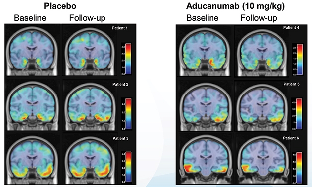 Stavolta, lo riconosco, questa segnalazione, che oltretutto corrisponde a un mio “pronostico” di un anno fa, potrebbe peccare di wishful thinking. Eppure, dopo molti sforzi e molte delusioni, pare che ci si possa trovare davanti a qualcosa di decisivo. Mentre infatti diverse ricerche, apparse inizialmente promettenti, si sono alla fine rivelate infruttuose, un’azienda farmaceutica ha finalmente presentato i risultati di un trial su pazienti affetti dalla malattia che al contrario, mentre inizialmente sembrava non offrire novità, avrebbe fatto rilevare benefici reali, non sovrapponibili a quelli di un gruppo di controllo a cui è stato somministrato un placebo. Addirittura, come si vede appunto nell’immagine qui sopra, la presenza nell’area mediotemporale cervello di depositi della proteina Tau, che è il “materiale da costruzione” delle strutture filamentose tipiche dell’Alzheimer, sotto la somministrazione di dosi elevate del farmaco Aducanumab non solo non aumenta (come nei pazienti sottoposti a placebo), ma diminuirebbe.