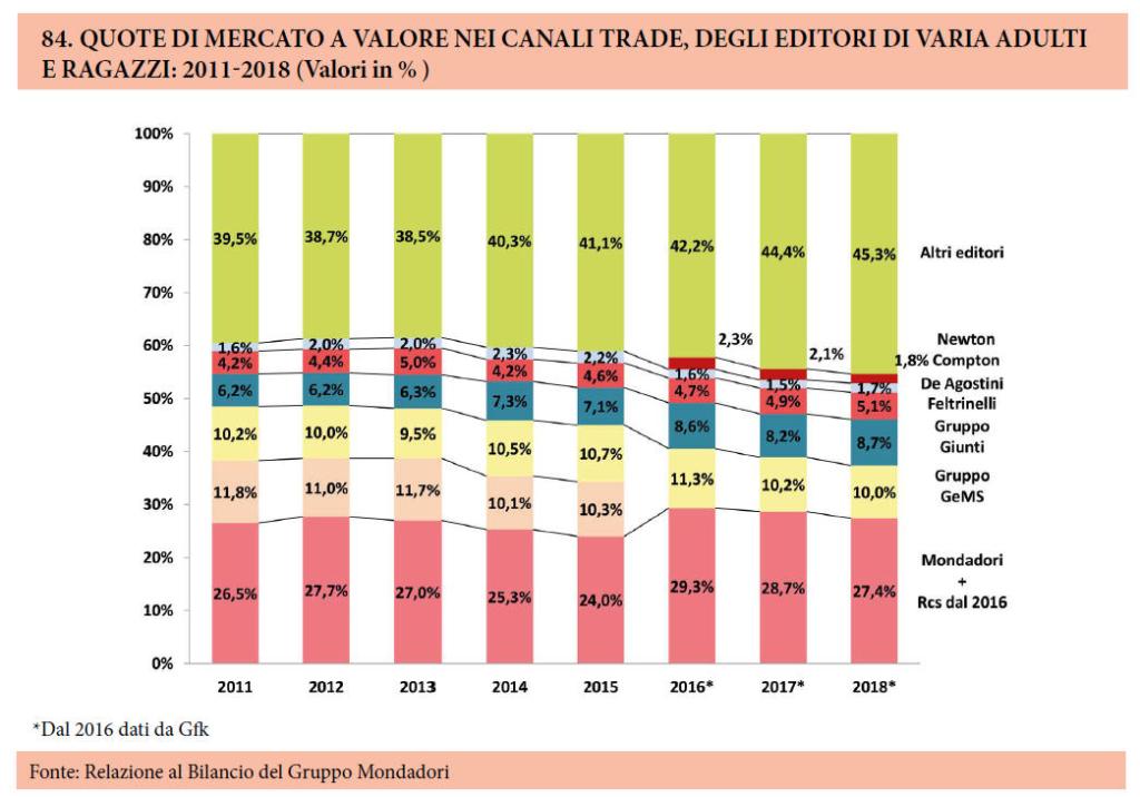 Insomma, a me pare chiaro che il settore della narrativa per adulti sia in declino, non tanto ovviamente per i risultati del 2018 (che sembra peraltro siano compensati da un migliore andamento del 2019), ma per la tendenza di medio-lungo periodo, parzialmente controbilanciata dalla narrativa per ragazzi e per “giovani adulti”. A questo declino della fiction tradizionale si affianca quello, speculare, dei canali di distribuzione tradizionali: come si vede nei due grafici qui sotto, le grandi case editrici e le librerie “fisiche” controllano una parte sempre meno dominante del mercato: la vendita online (cui va aggiunta Amazon) e gli editori medio-piccoli, quelli almeno che riescono a non chiudere, crescono e stanno erodendo progressivamente le vecchie rendite di posizione.