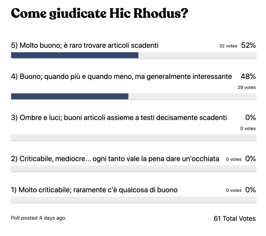 Ma sono appunto i commenti a essere assolutamente più importanti: a parte un paio appuntati sulla pagina Hic Rhodus di Facebook, tutti gli altri sono in calce al sondaggio; potete facilmente leggerli tutti da soli.