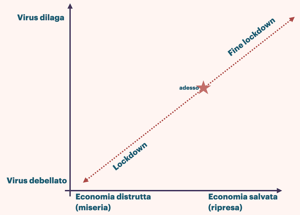 la posizione di Conte è lose-lose: o perde o perde. Se tiene chiuso si addosseranno a lui le colpe dell’impoverimento, se riapre gli si addosseranno quelle dell’ecatombe.