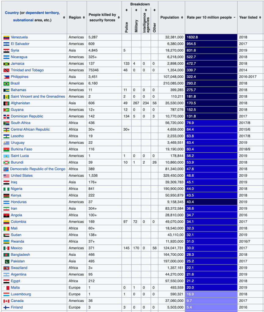 La tabella è molto più lunga e l’abbiamo tagliata col primo paese europeo in lista; per dire: l’Europa ha norme di ordine pubblico molto diverse da quelle americane (e di altre parti del mondo assai violente) e alcune pratiche dei cop da noi sono, semplicemente, vietate.