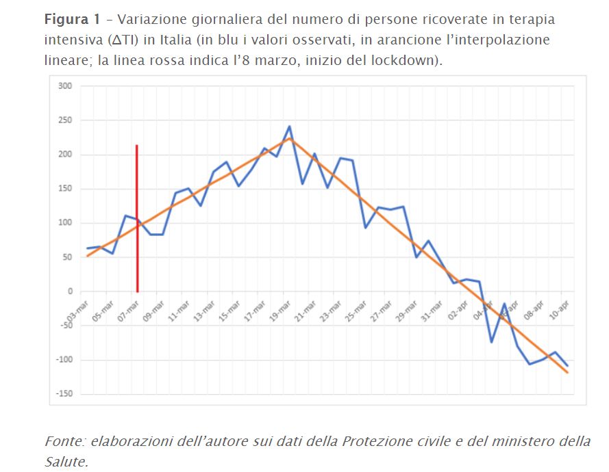 Per affermare che il lockdown sia stato efficace, approfitterei di un articolo appena pubblicato su lavoce.info, nel quale, usando sostanzialmente un’analisi di tipo statistico, l’autore conclude che, concentrandosi sul periodo immediatamente successivo al lockdown, è evidente l’inversione di tendenza (da crescente a decrescente) sia relativamente ai ricoveri in terapia intensiva sia ai decessi, con uno sfasamento temporale coerente con quanto si sa sui tempi di incubazione della malattia. A titolo di esempio, riporto qui sotto il grafico relativo ai ricoveri in terapia intensiva.