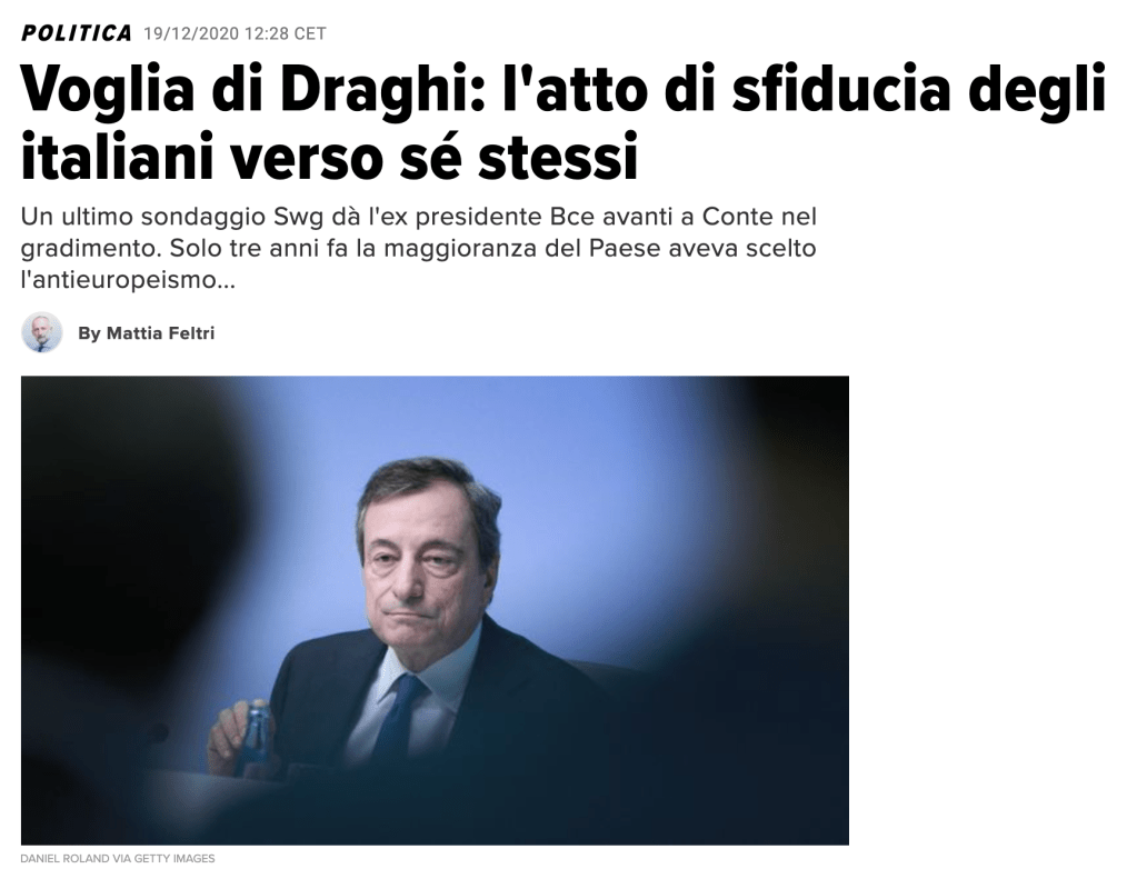 Le cose non stanno così, e – lo dico da cittadino che darebbe a Draghi le chiavi del Paese, subito, ad occhi chiusi – alla fine della storia mi pare che spesso, non forse in questo caso, i sondaggi, le inchieste, le classifiche servano più a subornare l’opinione pubblica che non a informarla. A costituire i requisiti di base per una qualche successiva azione politica, anziché aiutare i cittadini ad affrancarsi da ogni forma eterodiretta di manipolazione politica.