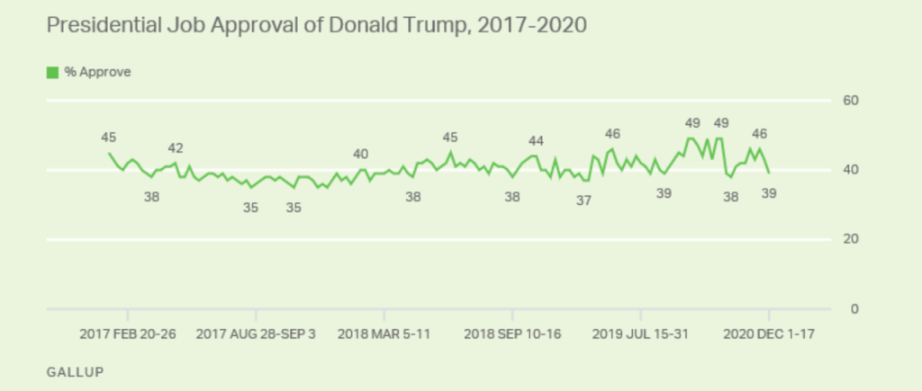 Dal punto di vista che voglio trattare, che non è quello della mera cronaca, ci sono questioni etiche, politiche e istituzionali di enorme spessore, che oggi, qui a caldo, posso solo tratteggiare a livello generale: le responsabilità di Trump; le responsabilità di coloro (e sono stati molti, anche se oggi le fila si sono assottigliate) che hanno accettato passivamente, girandosi dall’altra parte, la protervia eversiva trumpiana (leggi approfondimento su USA Today); la fine del Partito Repubblicano in USA; l’enorme, profondissima, divisione che lacera nei fatti il popolo americano. Quest’ultimo punto si riallaccia al primo, chiudendo questo cerchio da incubo: Trump è violento ed eversivo perché ha gran parte del popolo dalla sua parte; il popolo è sedizioso e violento perché istigato dal Comandante in Capo; una serie di figure istituzionali minori si adattano, si accomodano, accettano, ingoiano. Un sondaggio Gallup di poco più di una settimana fa indicava in Donald Trump l’uomo più ammirato d’America, col 39% di approvazione (in calo, ma pur sempre un record). Vale la pena segnalare che durante tutta la sua presidenza Trump è rimasto su queste percentuali, contro tutto e malgrado tutto (vedi grafico Gallup qui di seguito).