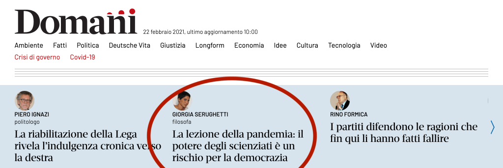 Nella giungla dei giornali digitali ogni click può valere qualche soldino per l’editore, e migliaia di click posso garantire la sopravvivenza di certi fogli che altrimenti avrebbero vita breve. Specie per gli ultimi arrivati, che non godono di una platea consolidata di lettori né di un gruppo storico di nobili firme, la lotta è dura; fortunatamente la loro ansia di riempire ogni giorno l’edizione con qualcosa di cliccabile si sposa perfettamente col narcisismo di autori e autrici meritatamente sconosciuti che trovano una tribuna per scrivere sciocchezze sesquipedali o, più facilmente, banalità con poco senso, inutili giri di parole colorate da presunzioni vagamente scientifiche, o da qualche bel parolone. Poi il titolista mette un titolo “croccante” (come direbbe il mio amico Alberto), e la candidatura al click è assicurata. Se un quotidiano specializzato in queste operazioni è quel Fatto Quotidiano più volte preso come bersaglio in questo blog, oggi trovo qualcosa di analogo in una testata ultima arrivata, Domani, che trovo sempre scarsissimamente interessante. Ma il meccanismo ha colpito anche me, ovviamente, e il titolo non poteva non catturarmi: La lezione della pandemia: il potere degli scienziati è un rischio per la democrazia, di tal Giorgia Serughetti di cui parlerò più avanti. Sono pronto a scommettere il mio ultimo Euro che il titolo è redazionale e che la povera Serughetti c’entra poco, ma il titolo è di una cialtronaggine inaudita. “Il potere degli scienziati è un rischio per la democrazia” piacerà sicuramente a tutti gli ignoranti, gli antivaccinisti, i terrapiattisti, i suprematisti bianchi trumpiani e a tutti i pseudo-governatori delle nostre Regioni, ma poiché le parole sono pietre (come ben saprà, credo, spero, la Serughetti che si definisce “filosofa”) il concetto