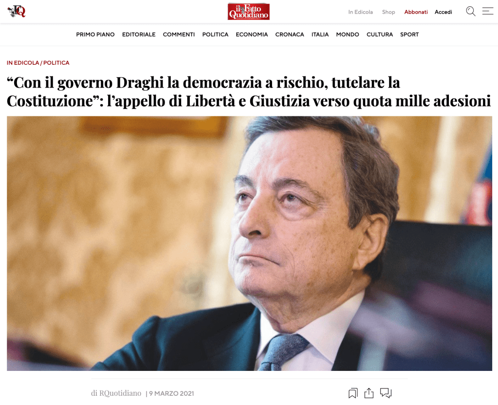 Pochi giorni fa l’associazione ha pubblicato un appello intitolato L’attesa messianica, e ripreso proprio ieri dal Fatto Quotidiano, organo di stampa ufficiale del populismo di destra e di sinistra, col non equivocabile titolo: “Con il governo Draghi la democrazia è a rischio”.